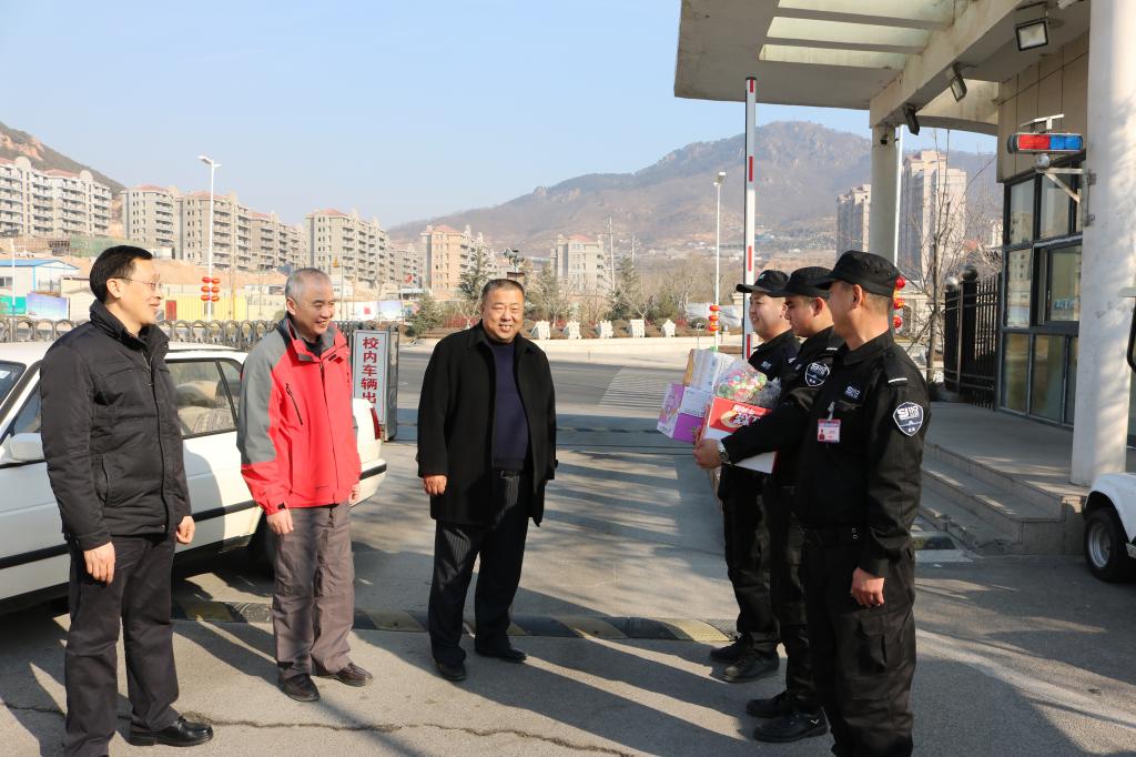 2月7日,副校长张元利在校办副主任聂广明陪同下走访我处坚守岗位的干部职工,感谢寒假春节期间保卫处值班护校,为平安校园作出的奉献,并向我处干部职工及参与护校工作的山东众安安防服务有限公司、青岛和兴保安服务有限公司员工送上诚挚的问候、新春的祝福和慰问品