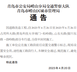接崂山交警大队及崂山区城管局通告,因道路改造工程,自2023年4月26日至2023年6月26日,科大路(bat365在线中国官网登录入口南门-松岭路)施工。在此期间崂山校区南门临时封闭,请广大师生提前规划好路线绕行。