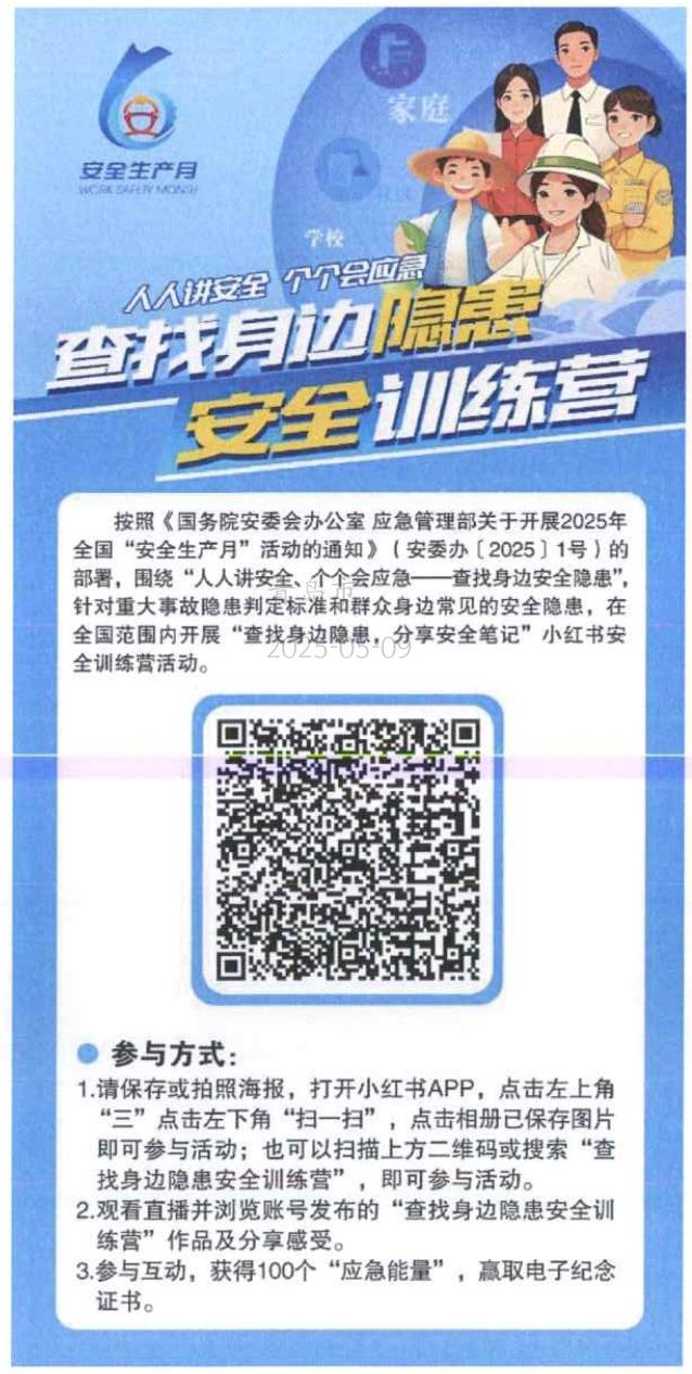 2.参与形式。本次小红书安全训练营为公益宣传活动,自愿参与,无任何收费;通过关注小红书“查找身边隐患安全训练营”账号参与活动,观看应急科普短视频和专家直播,学习应急科普知识;分享"查找、报告或消除身边安全隐患"的安全笔记。