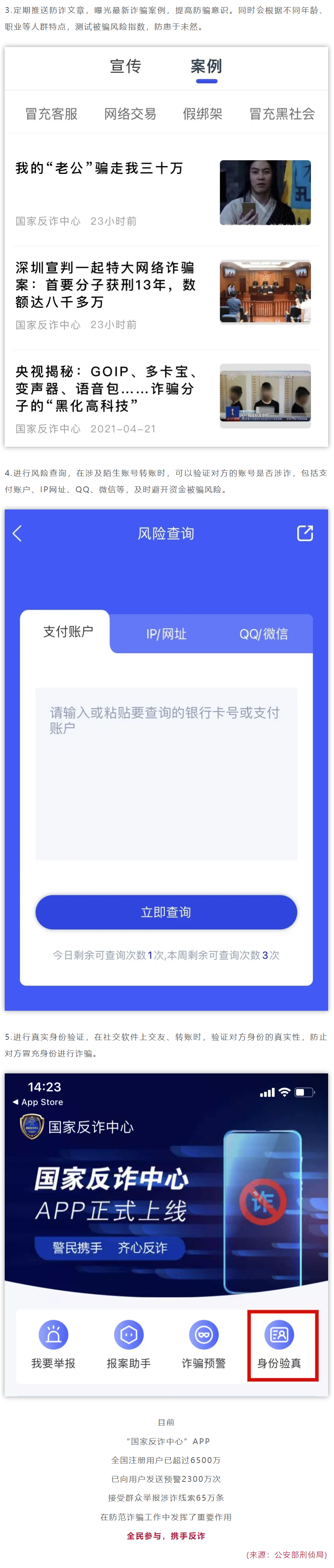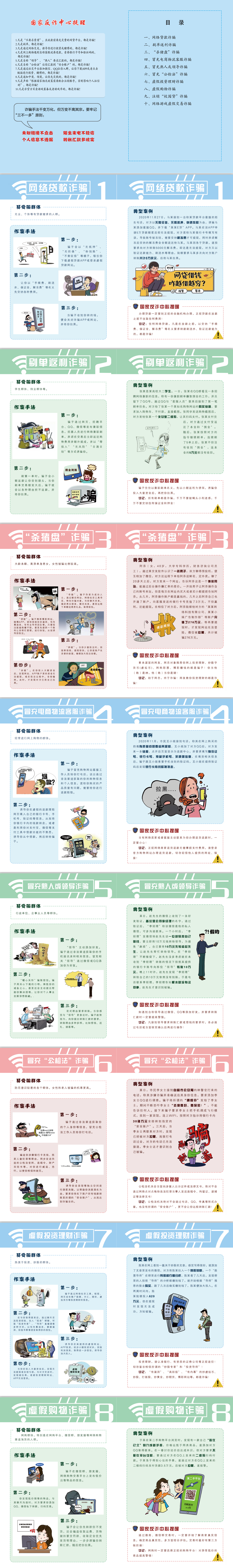 为进一步扩大反诈宣传覆盖面,提高广大群众防骗意识,国家反诈中心制作了《防范电信网络诈骗宣传手册》,向广大人民群众介绍了十种常见的电信网络诈骗类型,揭批了诈骗犯罪手法、文末有防骗神器,同时进行了防骗提示。