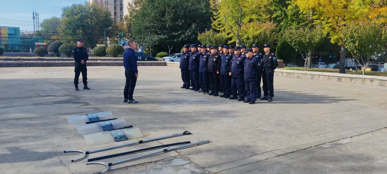 此次培训演练中,章晶警官系统阐述了防暴盾、防暴叉、防暴棍等专业器材的使用方法及注意事项。他通过专业讲解与规范的实际操作演示,使保安人员深刻认识到这些器材在应对突发事件时的关键作用。章晶警官亲自示范与 “歹徒” 对峙及实施控制的方法,动作果敢利落、精准有力。