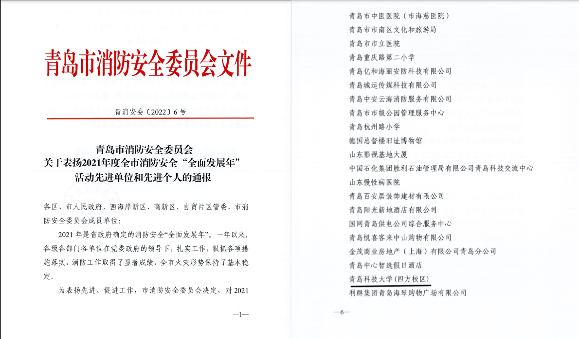 日前,青岛市消防安全委员会发布了《关于表扬2021年度全市消防安全“全面发展年”活动先进单位和先进个人的通报》,学校四方校区荣获先进单位荣誉称号,王佐林同志获评先进个人。