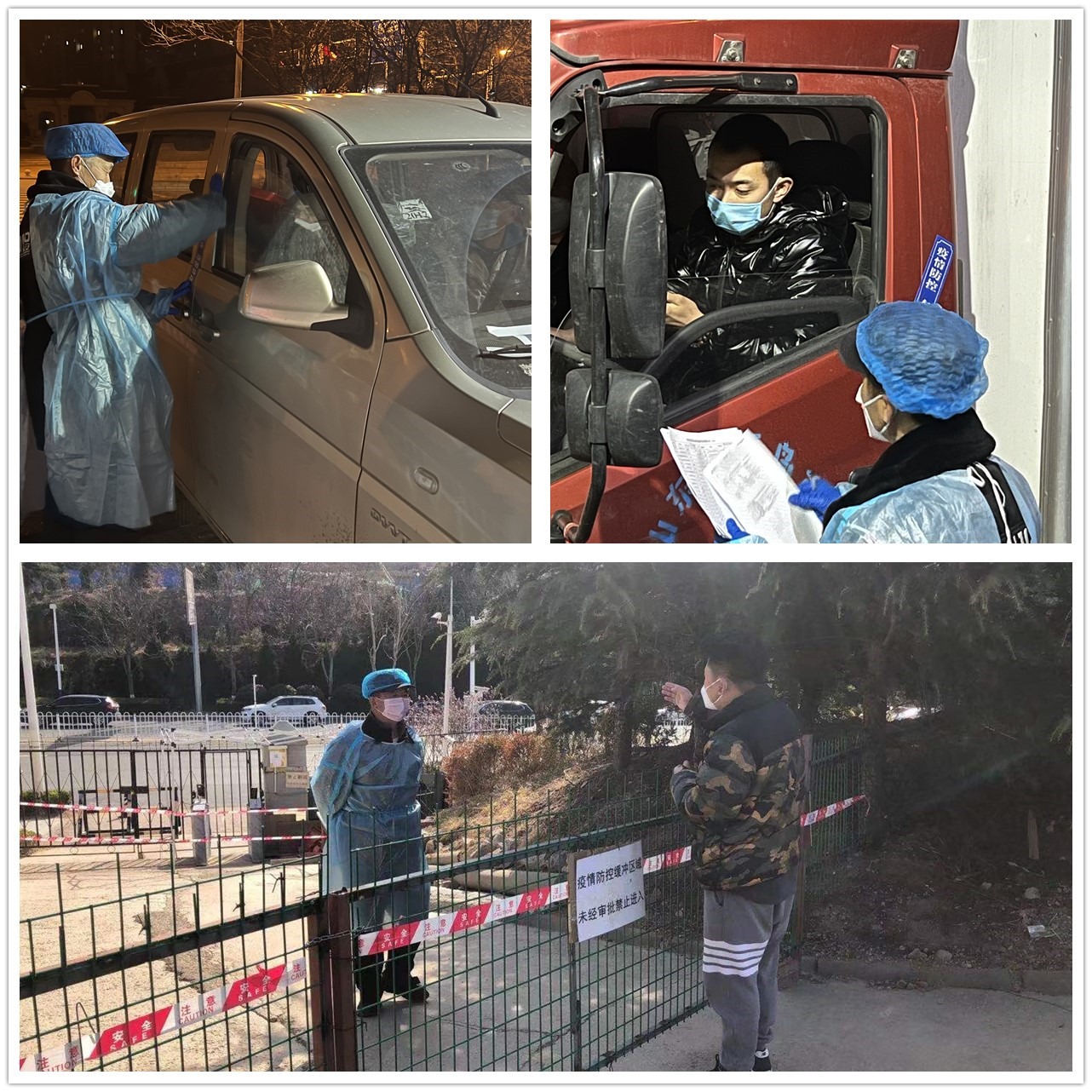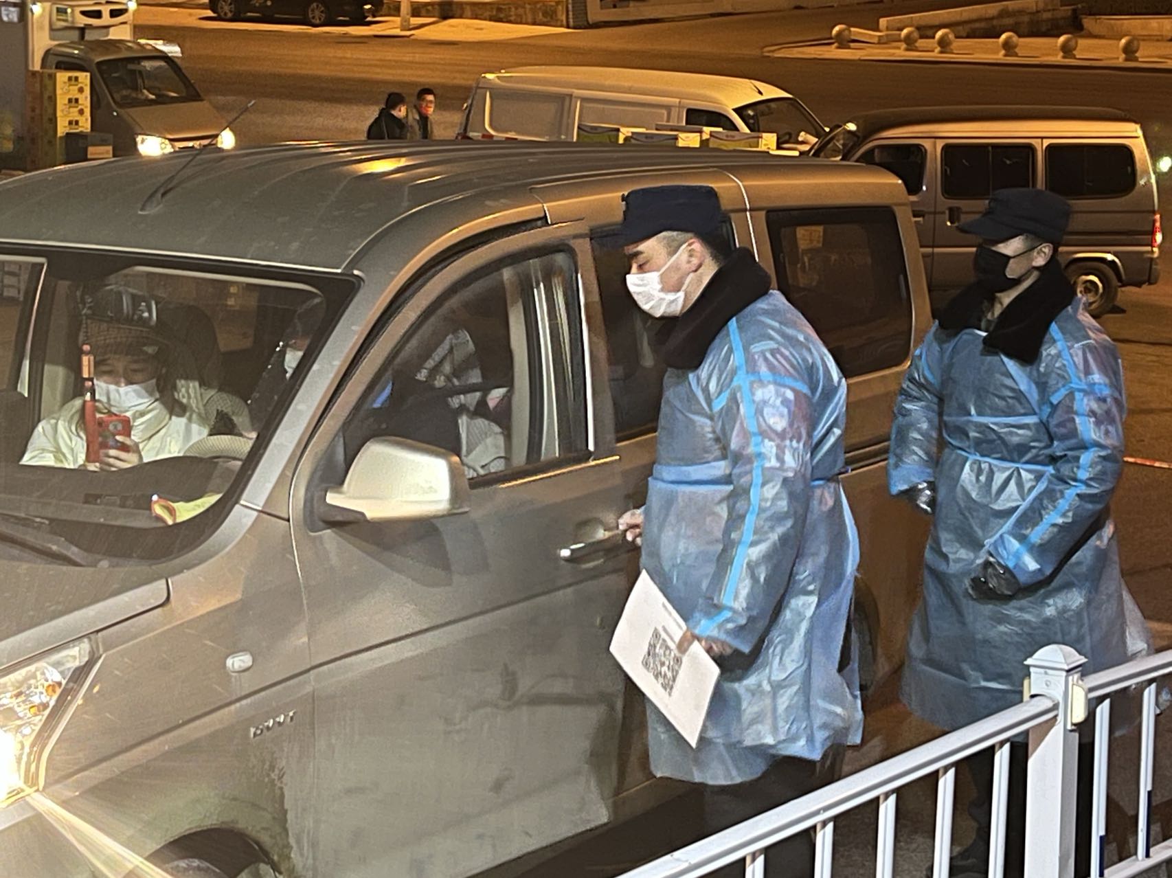 3月13日晚8时,校园疫情防控的值班老师们开车欲进入崂山校园,校园的其它大门均已关闭,只留东大门出入。车缓缓行进,大门值班室的两名校卫队员身着防护服,口戴口罩,逐个拦住了即将入校的车辆。他们挨个询问:“老师,请问您预约报备了吗?请配合测温,并出示健康码、行程码和核酸检测报告。请配合核对登记人员信息,谢谢!”只见每位入校值班老师很配合地做了核对查验工作,进了校园。