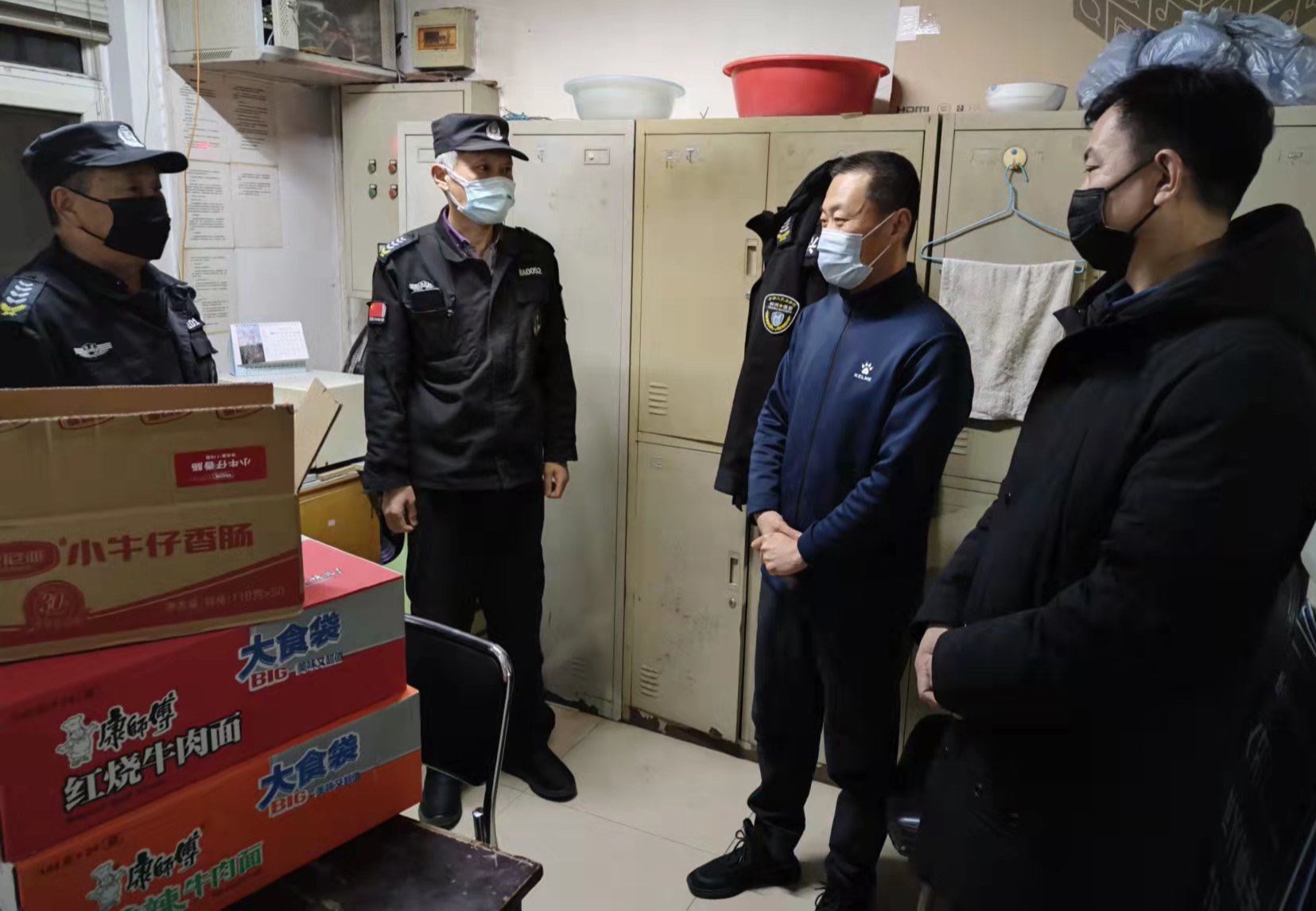 在保卫处领导的带领下,校卫队员们咬紧牙关,坚守岗位,每日做好门岗检查监督和校园巡逻排查工作;不分昼夜24小时校门守卫,有些队员都连续工作16小时。个别被挡在校外的保卫处老师和保安也纷纷打电话给处里,要求提前回来上岗;还有的已经值守24小时的校卫队员,希望继续值班以减轻处内的负担……谈起这些队员,王佐林处长动情地说:“队员们个个很朴实,这个特殊时期的值班,太辛苦了,夜里顶着寒风,白天坚持执勤,一点儿怨言都没有,我心里也非常感动!”于是,支部班子接连安排了三次慰问,并发放了水果、牛奶、方便面等慰问品,处里也为校卫队配齐了微波炉,确保他们能吃上一口热饭。队员们也备受鼓舞,为了学校防疫大局冲锋在前,人人心里有了主心骨、定心丸。