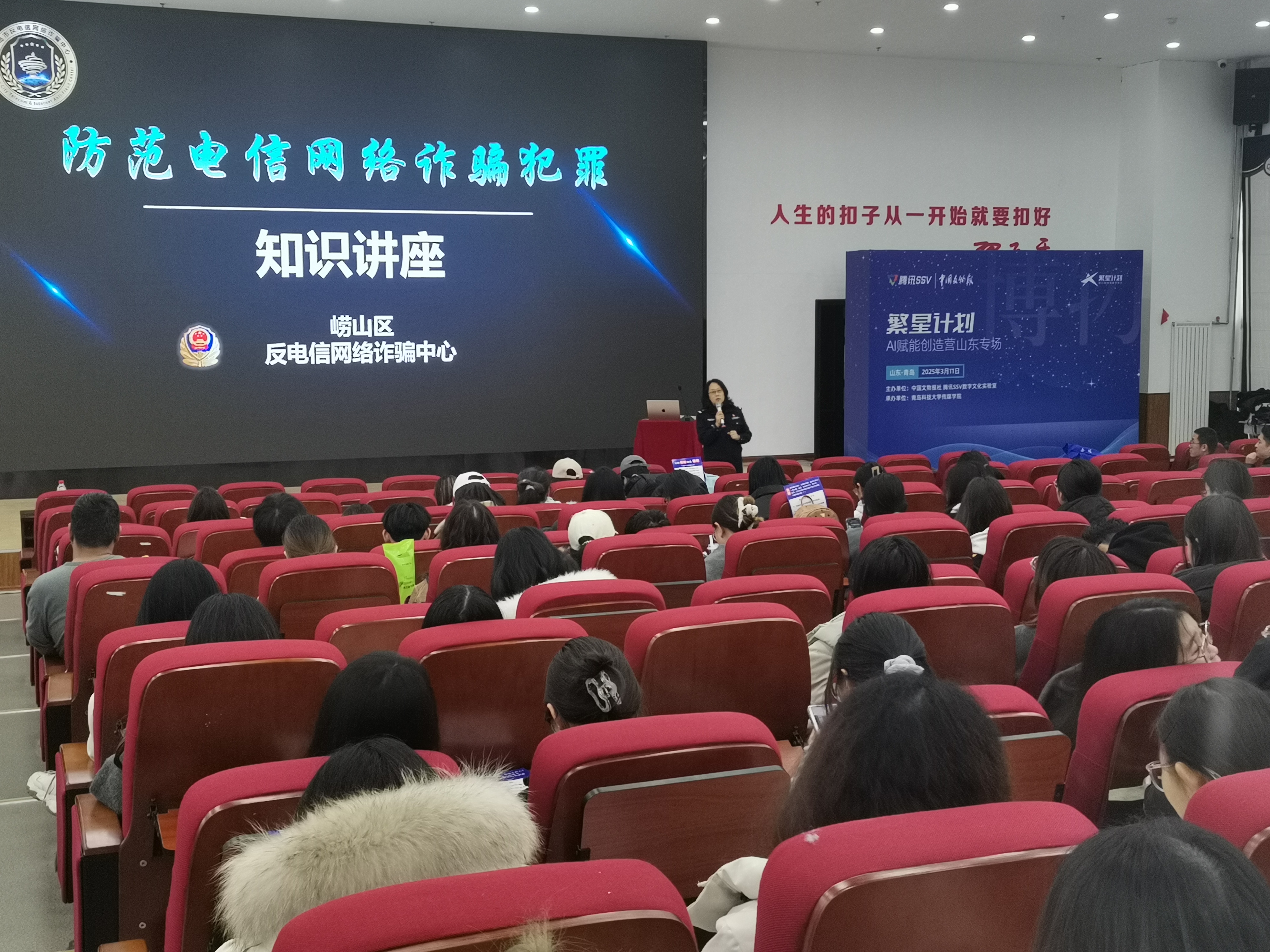 为增强学校师生防诈骗意识,进一步营造平安、和谐、健康的校园环境,3月11日下午,学校bat365在线中国官网登录入口联合崂山区金家岭派出所,在学校崂山校区北苑团学报告厅举行了一场“反诈宣传进校园”活动。