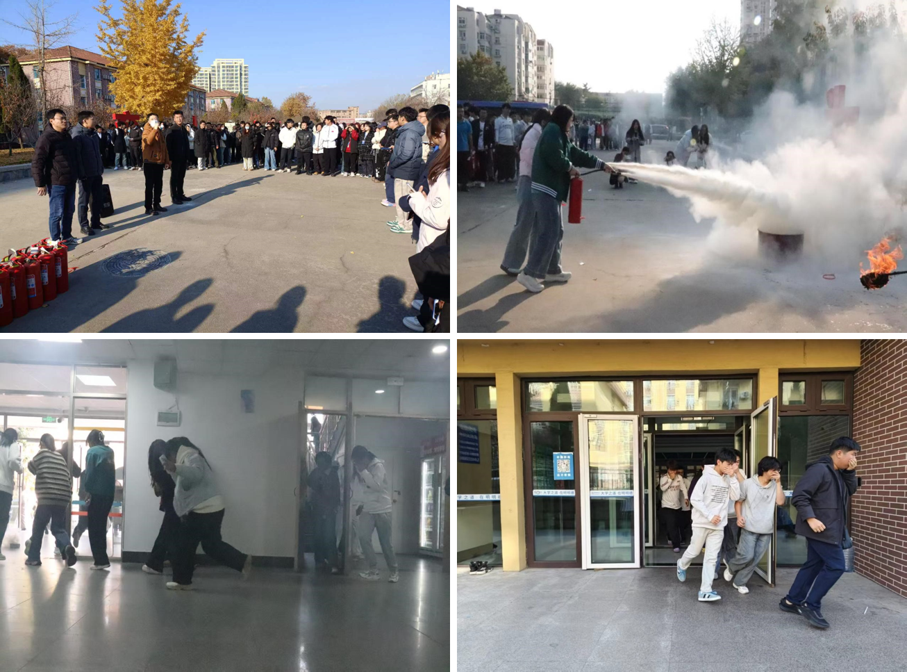 在演练实操环节,参训同学分组进行灭火器实操灭火体验、学生宿舍消防应急疏散逃生演练。整个实操演练过程组织有序,参训人员行动迅速,技术要领掌握得当,达到了预期效果。