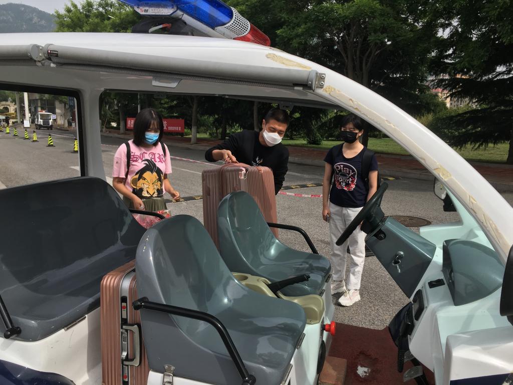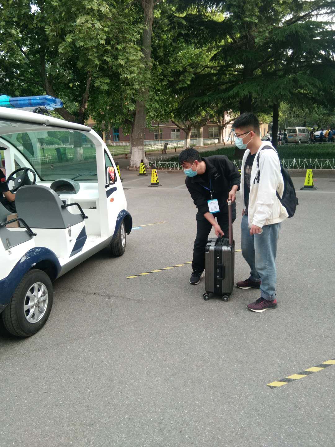 由于疫情防控需要,为了减少人员聚集,在学生返校当天,学校要求校外私家车辆和家长等陪同人员一律不能进入校园。为帮助入校后的学子尽快、轻松“返家”,回到各自寝室,保卫处党支部组织了“党员志愿服务队”,把四台消防治安电动巡逻车设立成返校学子行李搬运的“爱心专车”,并由处内党员轮流充当“托运员”,帮助有需要的部分学子把大件行李从学校门口运送至宿舍楼门口,减轻了返校学子们从学校门口到宿舍门口的物资运输难题。