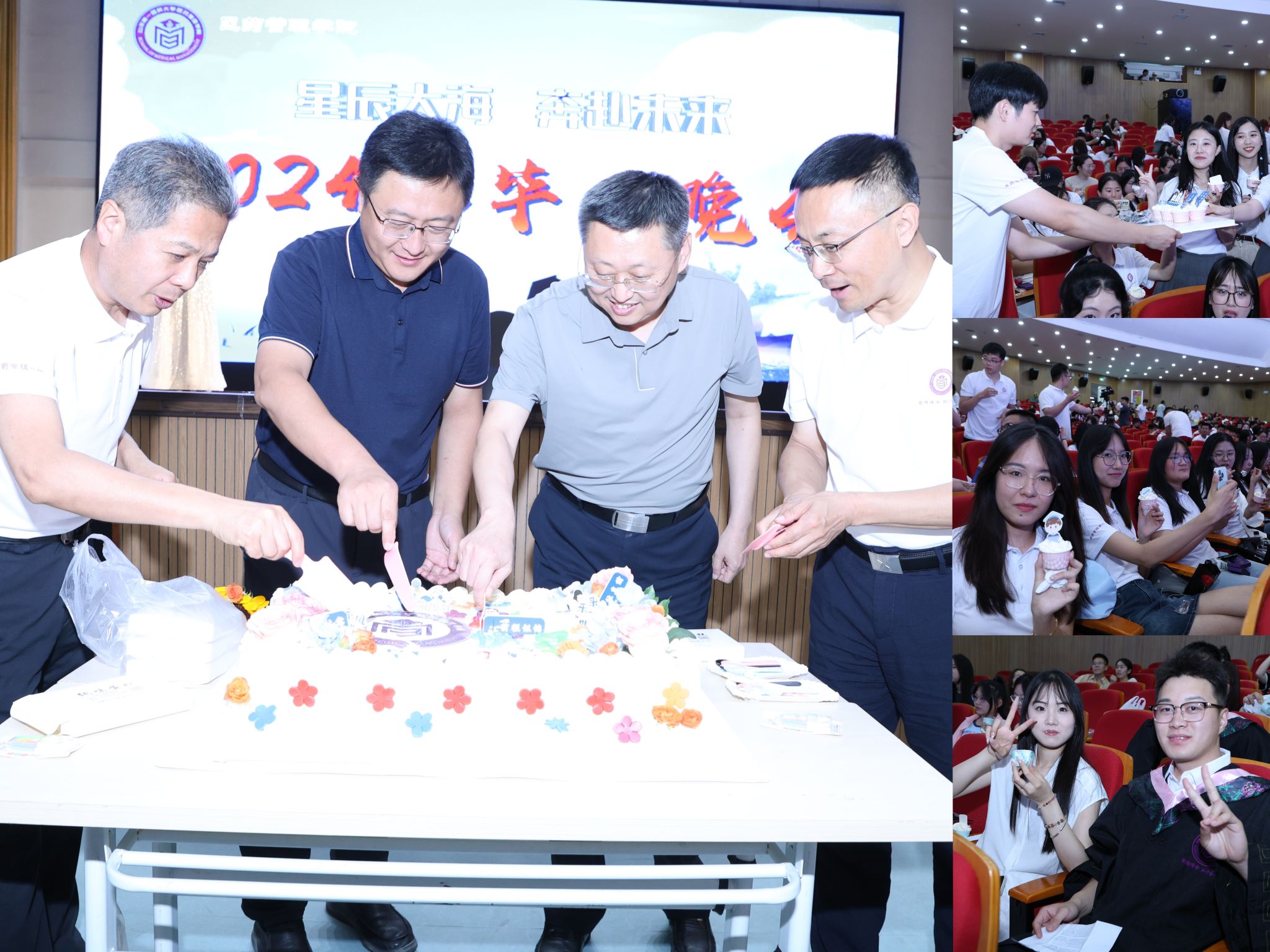 伴随着温情的音乐,大家最期待的切分毕业蛋糕环节到来,陈士福院长和杜江山书记为大家切分蛋糕,并邀请同学们共同分享,同学们一呼百应,师生共聚一堂、其乐融融。