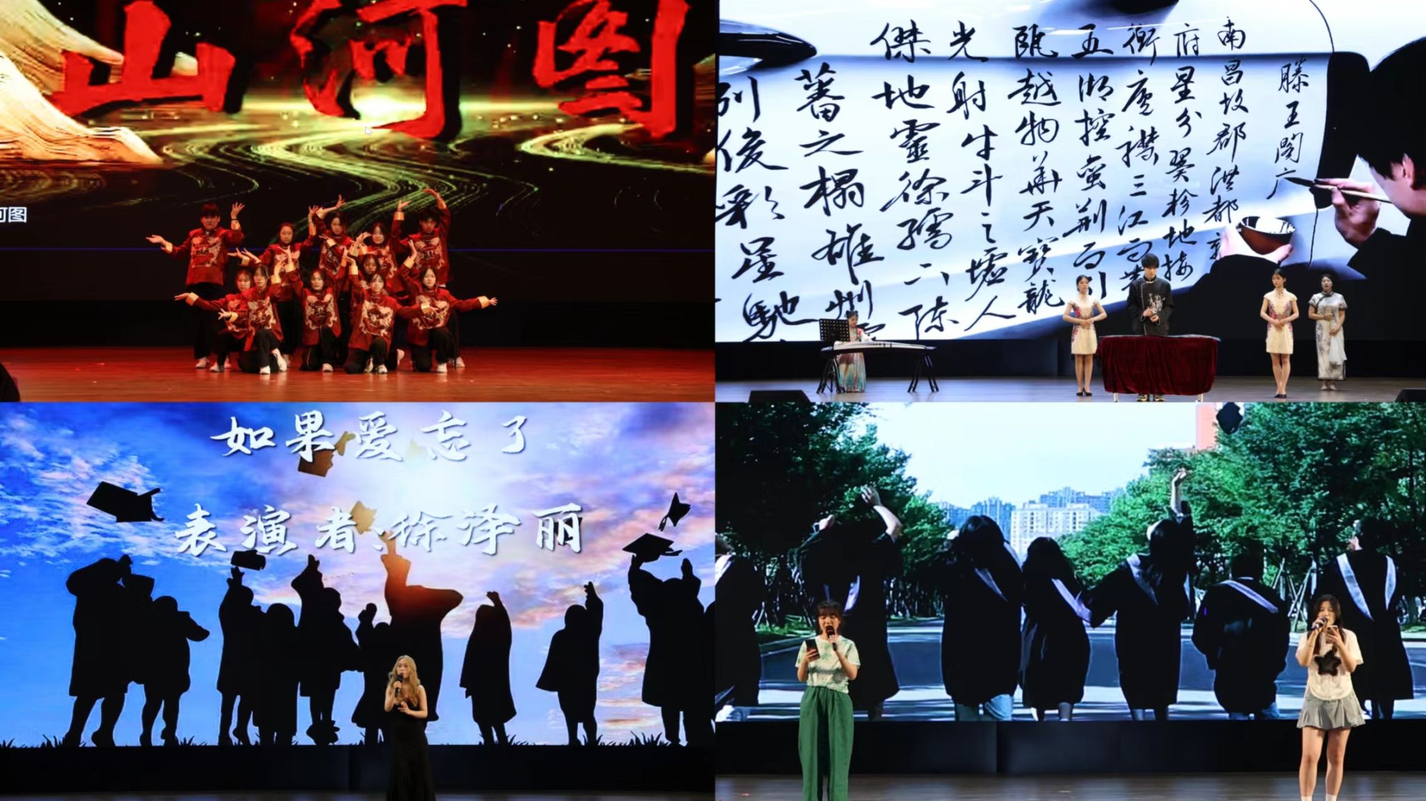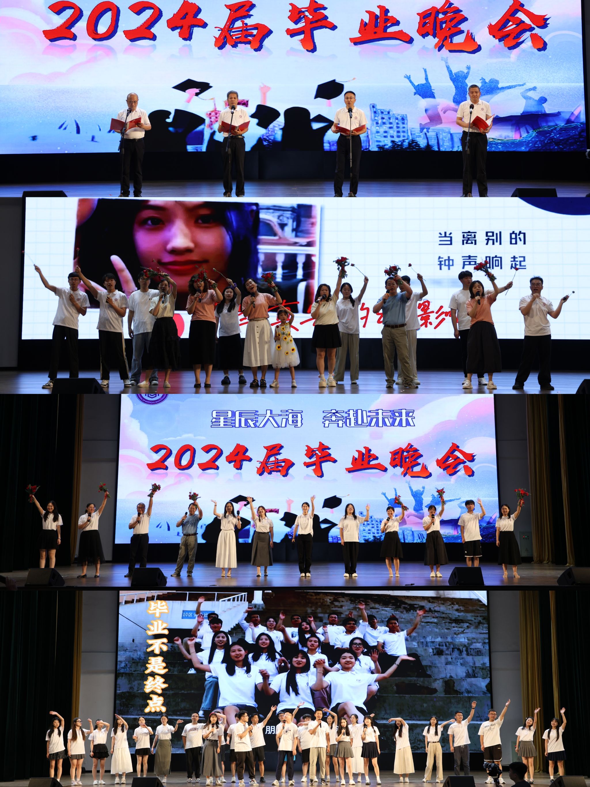 毕业晚会分为“青春礼赞”“共赴璀璨”“踏歌而行”“追光逐尘”四个篇章,歌曲、舞蹈、朗诵等节目形式多样、精彩纷呈,用最温情的告别为2024届毕业生们留下最难舍的记忆。