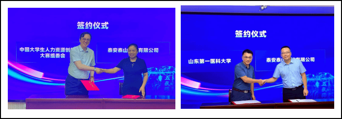 与会领导共同为“校地企招才引智工作站”“中国大学生人力资源创新实践大赛产教融合基地”揭牌。校(院)与泰安高新区、泰安高新科创集团共签校地企三方合作协议,并与泰安泰山科技有限公司签订横向课题委托协议。