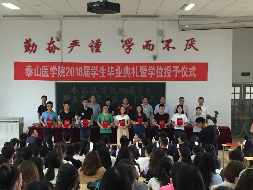 毕业典礼在庄严的国歌声中拉开了帷幕。首先,vwin德赢ac米兰官方网副院长苏宝利宣读了《关于表彰泰山医学院2018届优秀毕业生的通报》,随后,与会领导老师为优秀毕业生颁发了荣誉证书,学院院长许彦彬为毕业生代表授予学士学位。