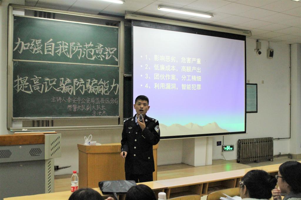 学院邀请了泰安市公安局岱岳区刑警大队副大队长古汝杰作为本次报告会的主讲嘉宾。首先,古警官就近年来我国电信诈骗案件触目惊心的数据进行讲解,并指出网络诈骗的形式主要有:冒充熟人诈骗、招聘诈骗、中奖诈骗、钓鱼诈骗等五种类型。同时,结合一些生动案例给大学生讲了防范措施,针对不法分子惯用的以电话、短信、微信、QQ等通信工具实施的诈骗手段,古警官指出要加以警惕和预防,要第一时间告知辅导员进行求助咨询,要多与家人核实、沟通,切忌贪图小利。随后,古警官就高校大学生受骗的心理、特点、人群等做了分析,对招聘诈骗、刷网评信誉等常见的诈骗类型、被骗的应对方法等做出详细讲解。最后,古警官提醒同学们注意“8个凡是方针”:凡是通知中奖,领取津贴,要先缴纳手续费、保证金的,都是诈骗;凡是让登录网站查看通缉令、登录银行卡信息的,都是网络诈骗;凡是通知家属亲戚出事先汇款的,都是电信诈骗等“8个凡是方针”。