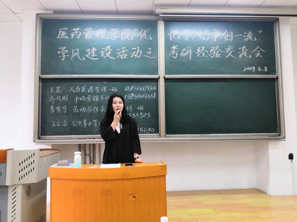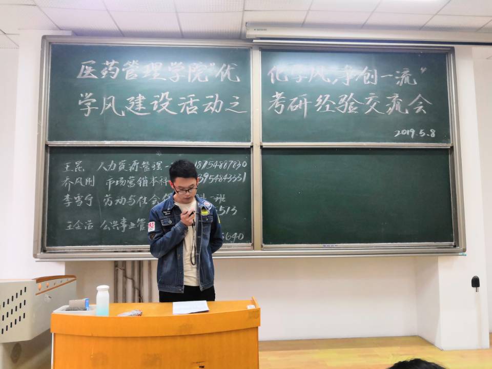 会议开始,主持人首先介绍了各位2019年考研成功学生,他们分别是考取哈尔滨医科大学的公共事业管理专业王金浩、考取南京师范大学的劳动与社会保障专业李雪宁,考取北京师范大学的人力资源管理专业王昆以及考取中国海洋大学的市场营销专业乔风刚,这几位同学都是各专业考研成绩的佼佼者。接下来,他们结合自身的专业特点,分别从不同的侧面跟大家分享了自己辛苦而无悔的考研经历,为即将考研的学弟学妹们提供了宝贵的建议:首先要立足专业兴趣,明确个人的专业方向;其次是在分析各学校专业优劣势的基础上有目的的选择报考的院校;然后结合自身情况制定好详细、合适的备考计划。备考的过程中要认真钻研真题,脚踏实地、一步一个脚印地进行系统学习;并建议同学们调整好心态,积极面对学习和笔试面试过程中所遇到的挑战,呼吁大家要坚持自律的生活态度,全身心地投入到备考当中去。生动的经验介绍赢得场下同学们的阵阵掌声。在交流会进入自由提问环节,同学们积极发言提问,优秀学生代表们认真回答,大家交流融洽,解答了许多备考同学们心中的诸多疑惑。
