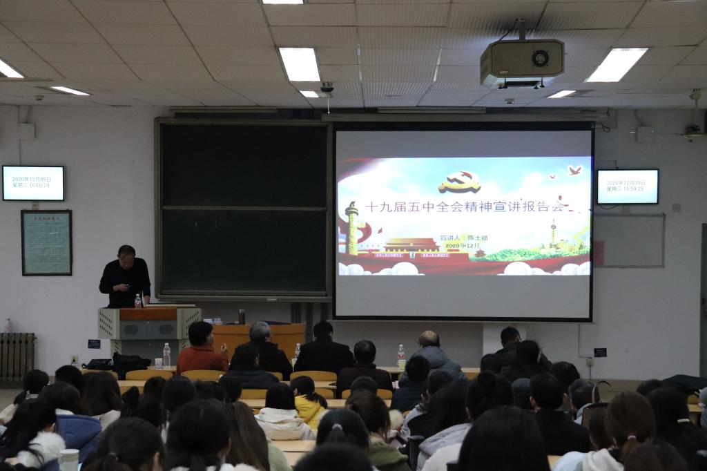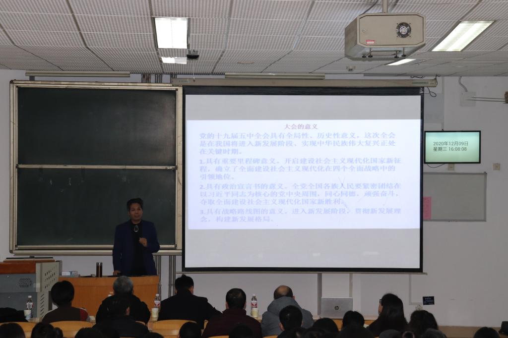 为深入学习贯彻党的十九届五中全会精神,根据校(院)《关于做好学习贯彻党的十九届五中全会精神宣讲工作的通知》要求,12月9日下午4点在教学南楼C2001教室,校(院)党的十九届五中全会精神宣讲团成员陈士福为部分师生作了党的十九届五中全会精神的宣讲报告,报告会由图书馆馆长段耀奎主持。图书馆泰安校区、期刊编辑部、口腔医学院和vwin德赢ac米兰官方网全体教职工和部分学生党员近200人现场参加了报告会,图书馆济南校区教职工线上集中收看了报告。