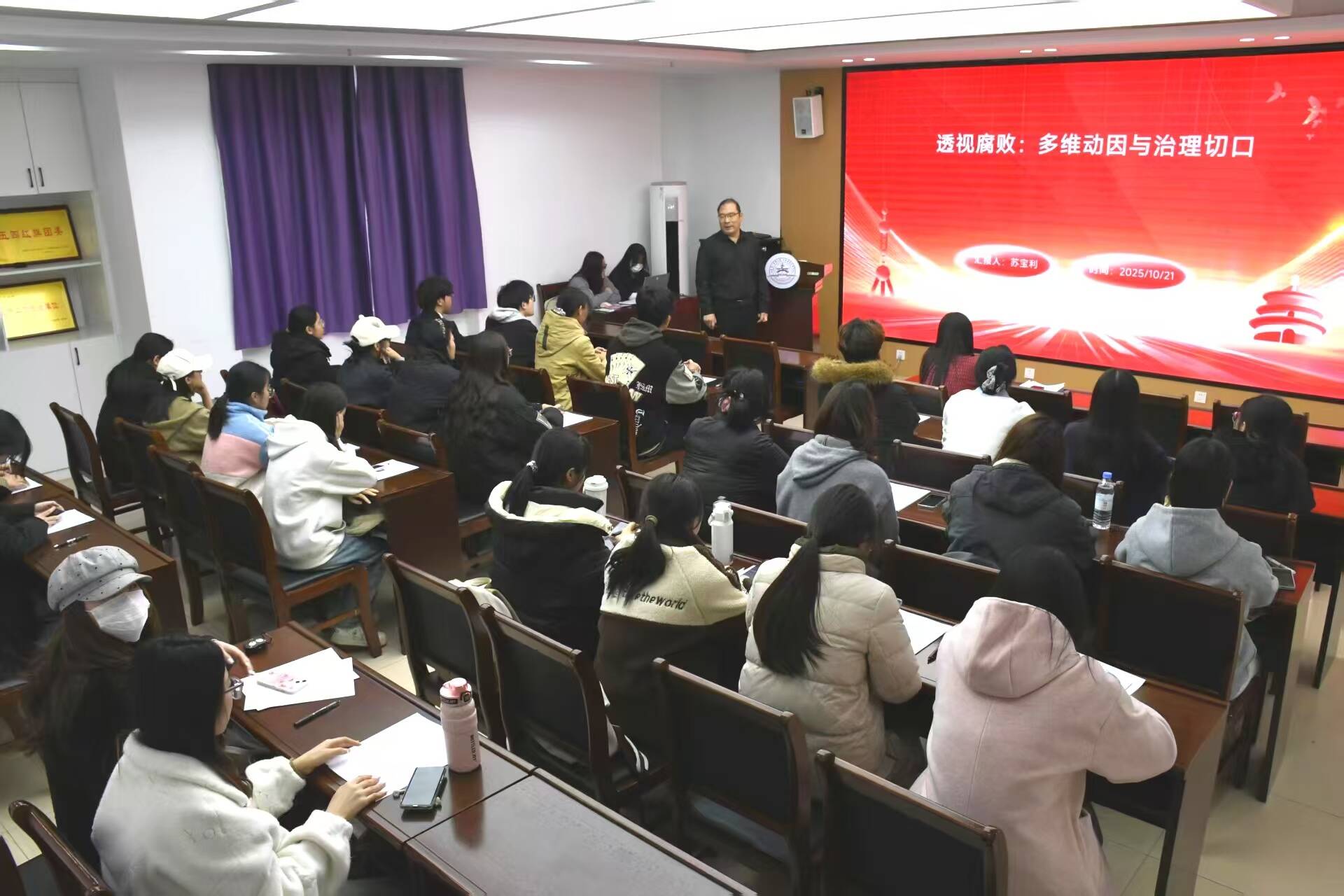 最后,苏宝利以《透视腐败:多维动因与治理切口》为题,为全体学员讲授专题党课,将廉政教育走进课堂。他结合典型案例,从历史、制度、文化等多个维度深入剖析腐败产生的根源,详细解读我国的反腐措施和反腐成效,课程既有理论深度,又有现实针对性,让全体学员正确认识我国的腐败现象。苏宝利强调,全体学员要从党课中汲取教训,牢固树立廉洁自律意识,严守纪律底线,不仅要在思想上入党,更要在行动上入党,以清正廉洁的作风和求真务实的态度践行对党的承诺。