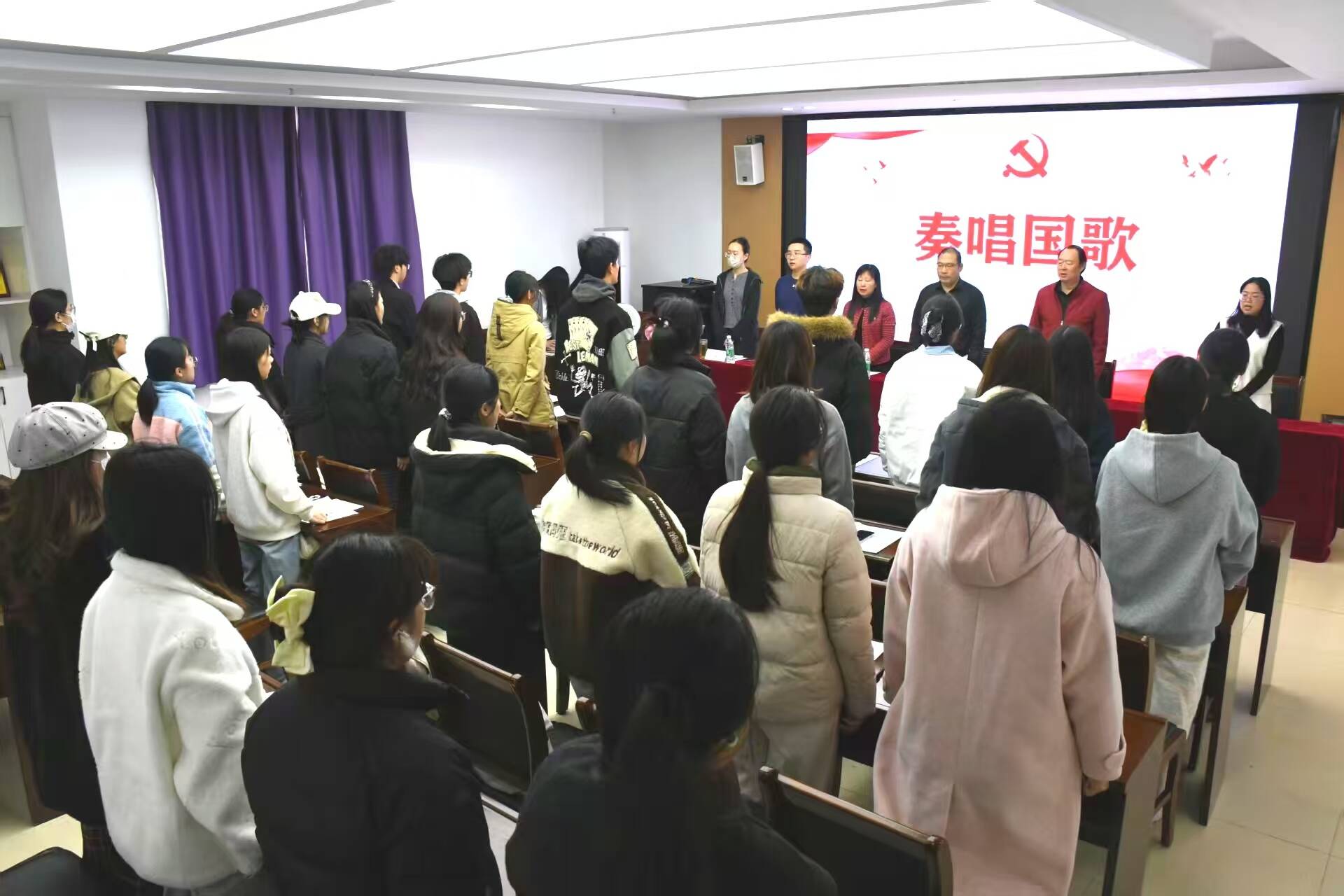 会议在庄严激昂的国歌声中拉开帷幕,全体起立奏唱国歌。