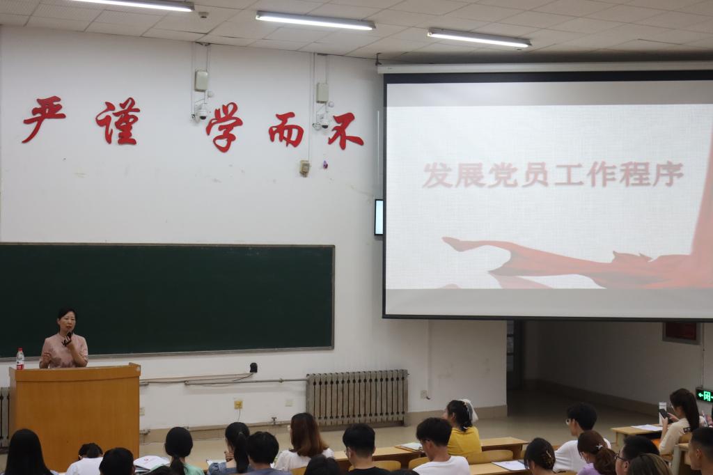 本次入党综合实务培训周晓芳简要介绍了发展党员的工作流程,共五个步骤,即申请入党、入党积极分子的确定和培养教育、发展对象的确定和考察、预备党员的接收、预备党员的教育考察和转正,帮助同学们进一步明晰了入党需要具备的基本条件和发展党员的基本流程,同时告诫同学们要积极努力,全面提升个人综合素质,不挂科、不违纪,争取早日被党组织吸纳。最后,向同学们简要说明了“发展党员工作全程记实表”的填写要求。