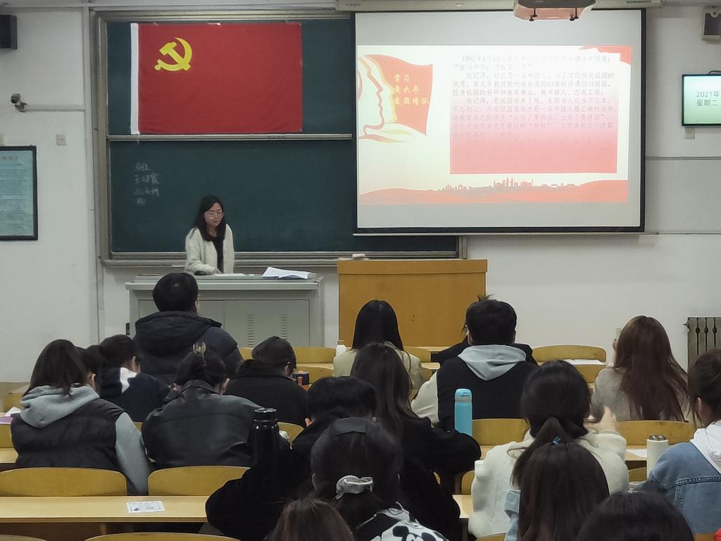 党支部书记王佳悦老师和杨苗苗老师主讲,全体学生党员参加,党员代表交流学习体会。