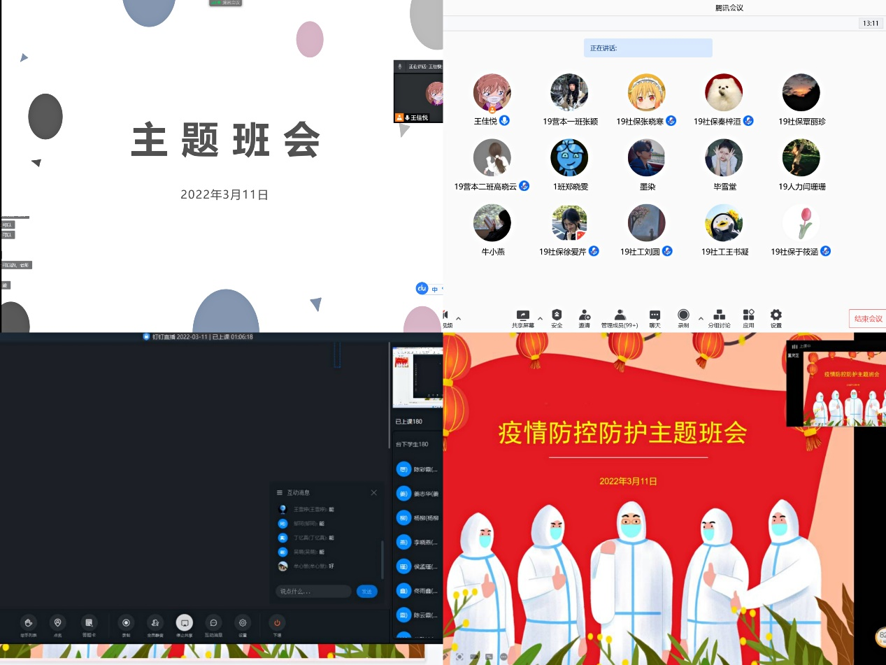 学院全体辅导员召开疫情防控主题班会。会上,辅导员老师对同学们关心的疫情问题做了解答,引导同学们放平心态,加强个人防护,减少不必要的外出,每日做好“一日三监”体温检测,严格学生请假制度,加强课堂考勤管理,做好校园安全防护。
