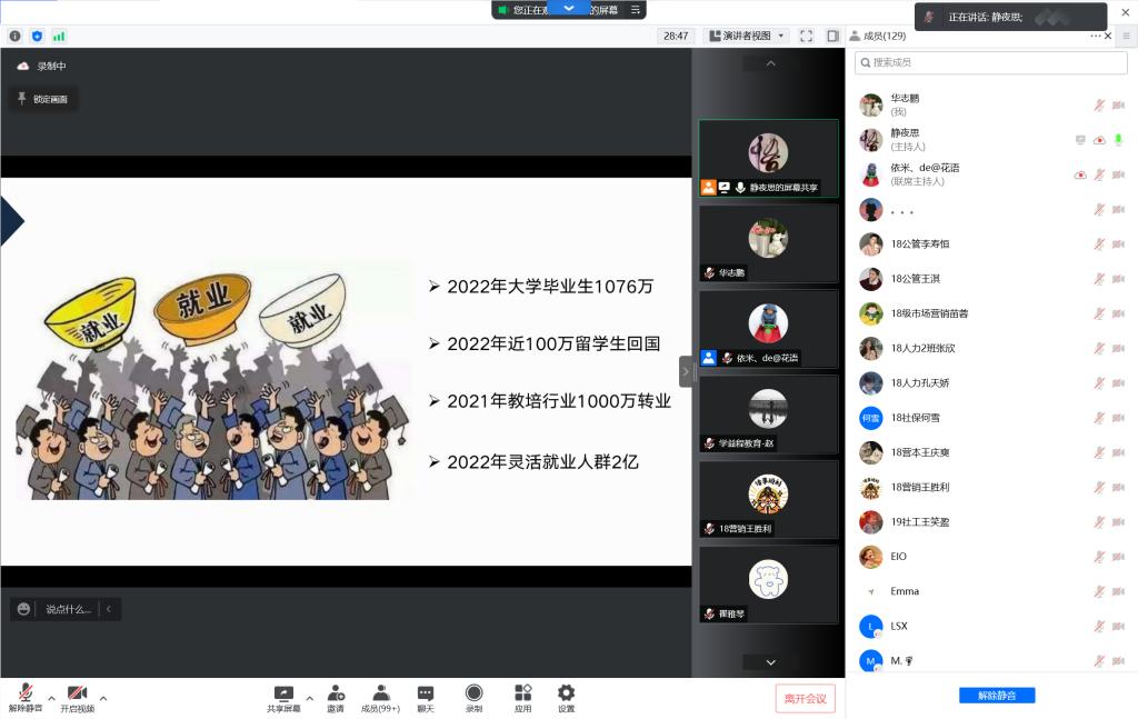 孙志刚从就业形势分析规划和简历指导两个大方面向同学们展开演讲。首先向同学们介绍了现阶段国内严峻的就业形势,指出2022年大学生毕业人数将会超过1000万,而灵活就业人数更是多达2亿。他表示,国家六稳六保方针的前提就是“首稳稳就业,首保保就业”,疫情环境下的同学们要想稳定就业就要做到自律,在大学四年的宝贵时间里增强自己的价值和竞争能力。孙志刚还从自主创业、招聘考试和企业面试三个方面为同学们进行就业分析,并希望同学们根据自我认知和人岗匹配的准则合理进行就业规划。