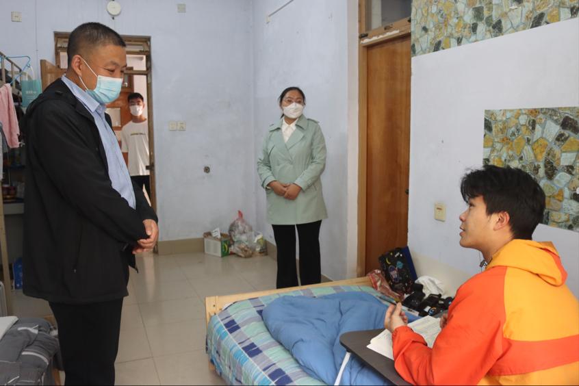 任纬兵一行还看望了因意外受伤同学19级公共管理专业宫厚贤。任书记代表学院向宫厚贤同学表示亲切慰问,询问该同学近期遇到的问题,叮嘱其有困难第一时间找老师帮忙解决。此外,任书记赞扬了宫厚贤同学自主学习的精神,鼓励大家向其学习积极向上、勤奋刻苦的精神品质,并希望受伤同学能够安心静养,早日康复。