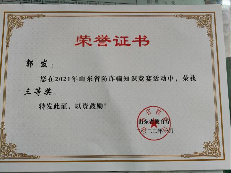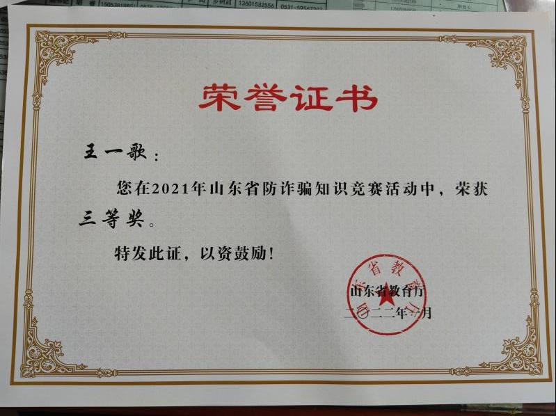 近日,山东省教育厅组织开展的“建行杯”防诈骗知识竞赛落下帷幕。vwin德赢ac米兰官方网2020级人力资源管理专业王一歌同学和2020级劳动与社会保障专业郭发同学荣获三等奖。
