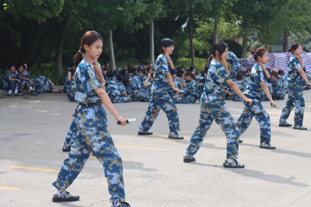 巾帼不让须眉,红颜一样刚强。九月初的阳光依旧火辣而张扬,在特色方队红缨连的训练场上,我们看到了vwin德赢ac米兰官方网学子们的身影,女生们手持匕首,在教官的指示下,一招一式精准有力,一声令下,扑通倒地,尽管摔得生疼,纵使汗如雨下,但女孩们没有抱怨,坚持训练,全然以“我是一个兵”的心态严格律己,用笔挺的军姿、清脆的口号、干净利落的动作展示了巾帼不让须眉的气势,将“坚持不懈、永不服输”精神展现得淋漓尽致。红缨连连长任学剑骄傲地说:“我们的女兵个个都是好样的,红颜更胜儿郎!”