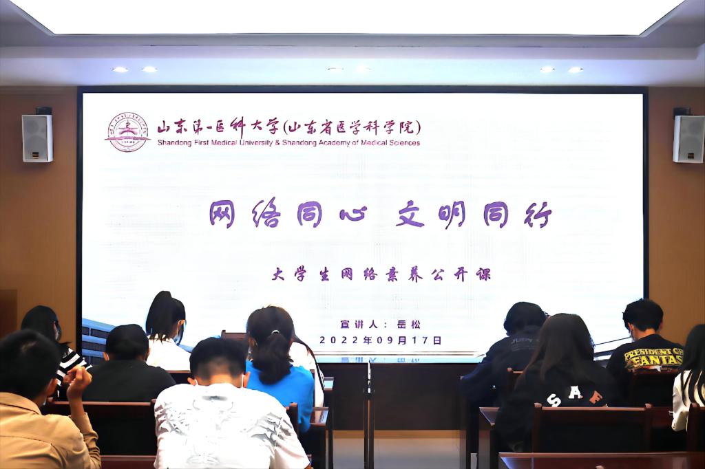 为进一步加强大学生网络文明教育,丰富同学们网络知识,提高网络素养,vwin德赢ac米兰官方网(山东省医学科学院)特举办“网络同心,文明同行——大学生网络素养公开课”。vwin德赢ac米兰官方网积极响应学校号召,组织2022级全体新生于大会议室参加本次公开课。山东理工大学马克思主义学院思政课教师岳松主讲本次公开课。