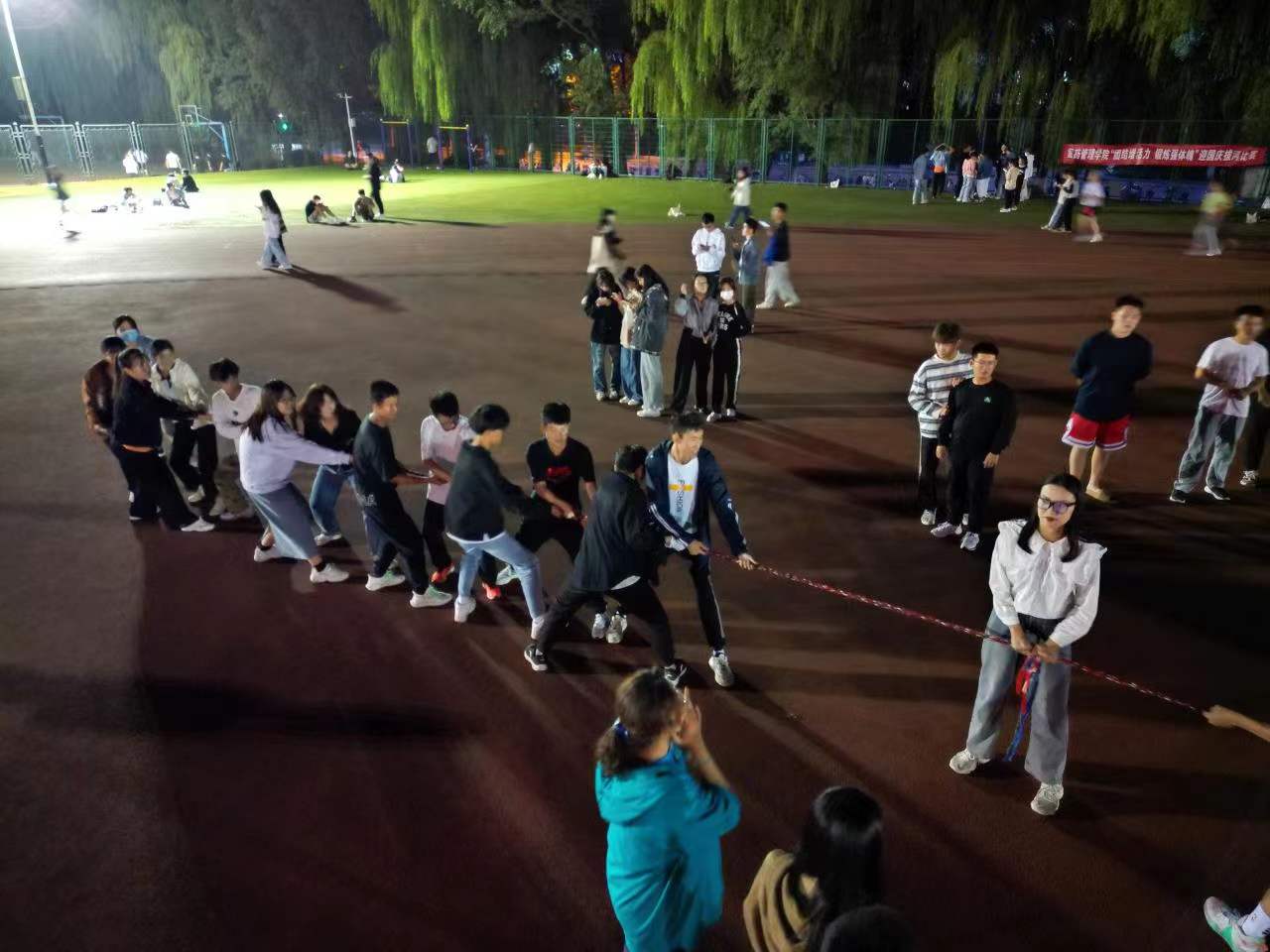 为了庆祝国庆节的到来,培养同学们的健康体魄,提高班级凝聚力,弘扬自强不息的体育精神,喜迎党的二十大的召开,vwin德赢ac米兰官方网于9月29日晚在vwin德赢ac米兰官方网老体育场举行庆国庆拔河比赛,2022级全体新生参与。