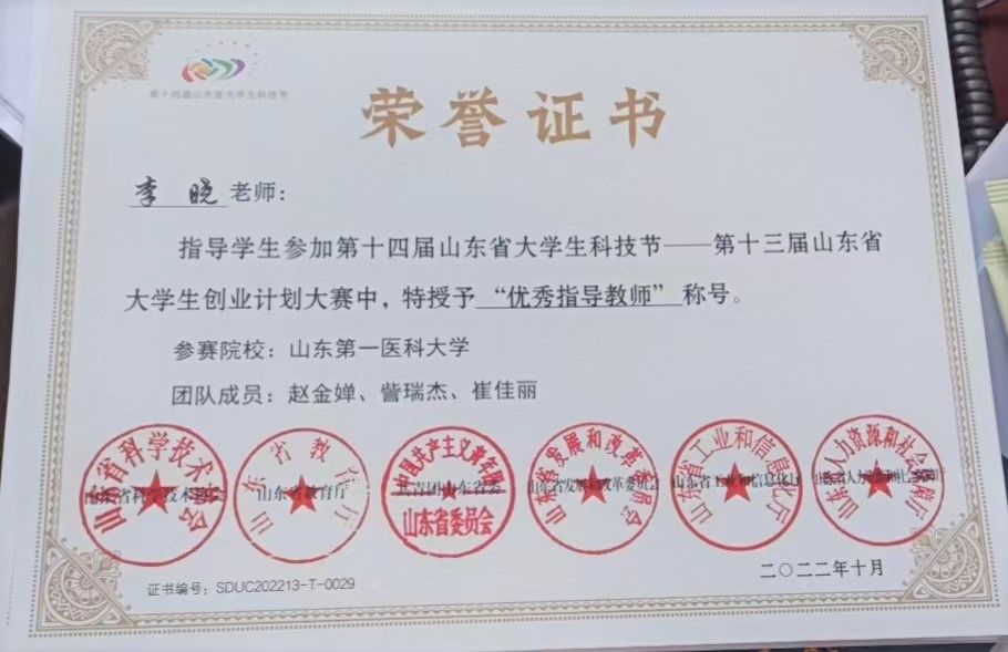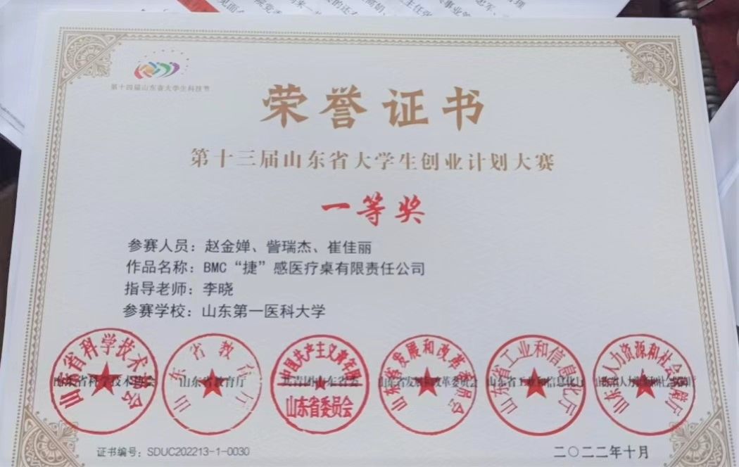 此次大赛是第十四届山东省大学生科技节赛事活动之一,以“创新 青春 创意”为主题,旨在帮助大学生打造核心竞争力,提高创新意识、创意思维、创业能力,为大学生就业、创业搭建平台、提高大学生就业、创业能力,增强大学生就业、创业信心,营造良好的社会创新与创业环境。据悉,本次大赛共收到来自全省70多所院校的1500余份参赛作品,参赛人数达到10000余人。德赢官网由20级市场营销专业的赵金婵、訾瑞杰、崔佳丽组成的参赛队伍经过赛前的长期调研,在比赛中充分发挥市场营销专业的优势,凭借丰富的比赛经验,悉心听取李晓老师对于各方面问题的指导完善,最终团队作品《BMC“捷”感医疗桌有限责任公司》斩获一等奖,李晓老师也荣获“优秀指导教师”的荣誉称号。