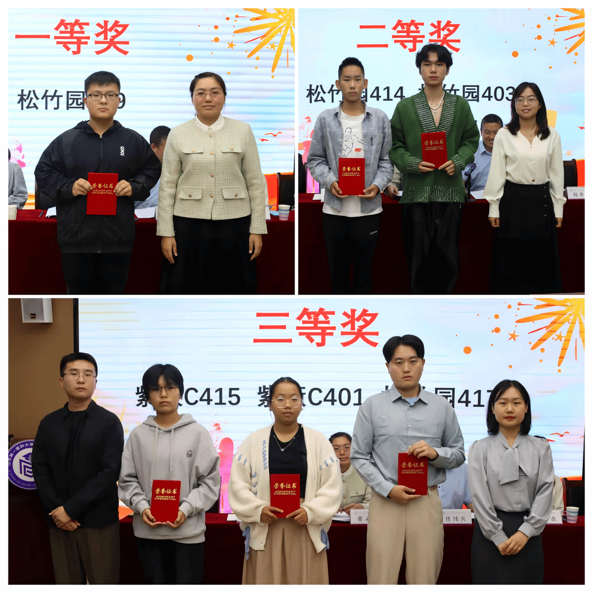 会议上,董灵芝宣读关于本次活动的任务要求和评选方案;杨苗苗、安静宣读获奖宿舍名单。任纬兵为推选“文明宿舍”称号宿舍代表颁奖;董灵芝、杨苗苗、安静、张少儒为获得“军训内务大比拼”活动的宿舍代表颁奖。