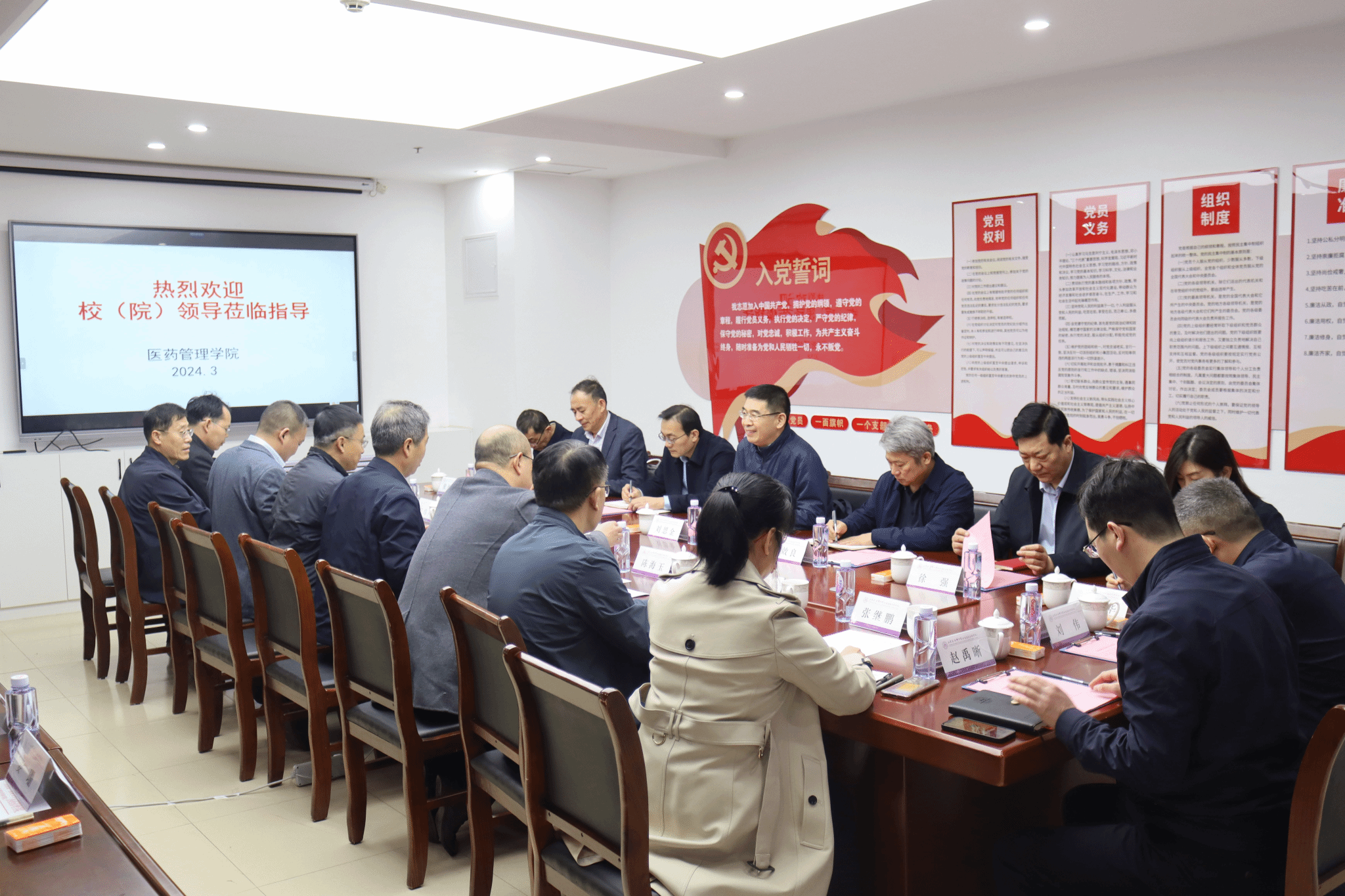 刘思金认真听取了学院工作情况汇报,围绕构筑立体化人才培养体系、培养医药特色管理类复合型人才同与会人员进行了深入交流,并提出了“四个紧密结合”的工作要求。一是与医学紧密结合。推动管理学与临床医学、药学、公共卫生学、护理学等学科交叉融通发展,培养兼具医学技能与管理知识的复合型创新创业人才;充分利用附属医院资源,建设有明显医学特色的管理学学科,赋能国家卫生健康事业发展。二是与产业紧密结合。加强校企合作,进行资源共享、技术交流,实现优势互补、互利共赢,提升学院发展的创造性、主动性和积极性;强化与医疗产业合作,探索举办各类医药管理培训,搭建专业学科与行业企业之间的深层次合作桥梁,提升学科建设水平,提高学院影响力。三是与国际合作紧密结合。拓展国际视野和渠道,坚持“送出去”和“请进来”双向发力,围绕“一带一路”建设,寻求国际合作办学,助力“一带一路”沿线国家管理型人才培养,畅通教育、科技、人才一体化发展的国际通行路径。四是与高水平人才引育留用机制紧密结合。建立“平台聚才”思维,精心打造高层次人才服务平台,多方位、多渠道、多举措吸引海外高层次人才;充分利用全校人才资源,合理运用校本部与附属机构人才双聘与互聘机制,联合申报国家自然科学基金,为人才成长提供更多机会和更优赛道,为加快推进一流大学建设作出更大贡献。