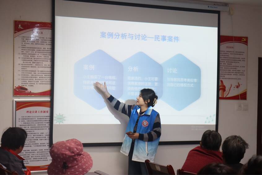 “宪法宣传进社区,法治意识入人心”。此次活动围绕这一主题与宗旨,向社区居民深入宣传了法律知识,在此次活动中,志愿者首先通过短片向社区居民讲解了宪法的产生与发展过程,又通过一些生动而又真实的案例向居民展示了法的重要性,更是从民事、行政、刑事三个方面的相关内容与解决措施等方面更详细地讲解了居民维护自身权益的途径。最后,志愿者们与社区居民进行“面对面”交流,通过答题并赠送小礼品的方式,使居民们在轻松愉快的氛围之中将法律内化于心,并在以后的日常生活中外化于行。