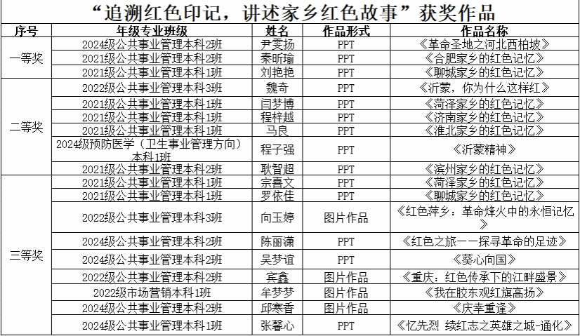 vwin德赢ac米兰官方网的同学来自全国各地,各自的家乡都有着丰富的红色故事和革命传统。大赛收到学院三个党支部来自不同年级不同专业同学的多幅优秀作品,展现了安徽合肥市、淮北市,广西桂平市,河北革命圣地西柏坡,吉林省通化市,江西省萍乡市,重庆市,山东省济南、临沂、聊城、菏泽、滨州等地方的经典红色故事与英雄人物,参赛作品选取的内容真实、典型、新颖,事迹富有感染力、生动形象,充分反映了家乡的红色文化,具有很强的教育意义,体现了时代精神。经学院评审,2021级公共事业管理本科1班刘艳艳同学的参赛作品《聊城家乡的红色记忆》,2021级公共事业管理本科2班秦昕瑜同学的参赛作品《合肥家乡的红色记忆》,2024级公共事业管理本科2班尹雯扬同学的参赛作品《革命圣地之河北西柏坡》获得一等奖,魏奇等6位同学的参赛作品获得二等奖,宗喜文等9位同学的参赛作品获得三等奖。