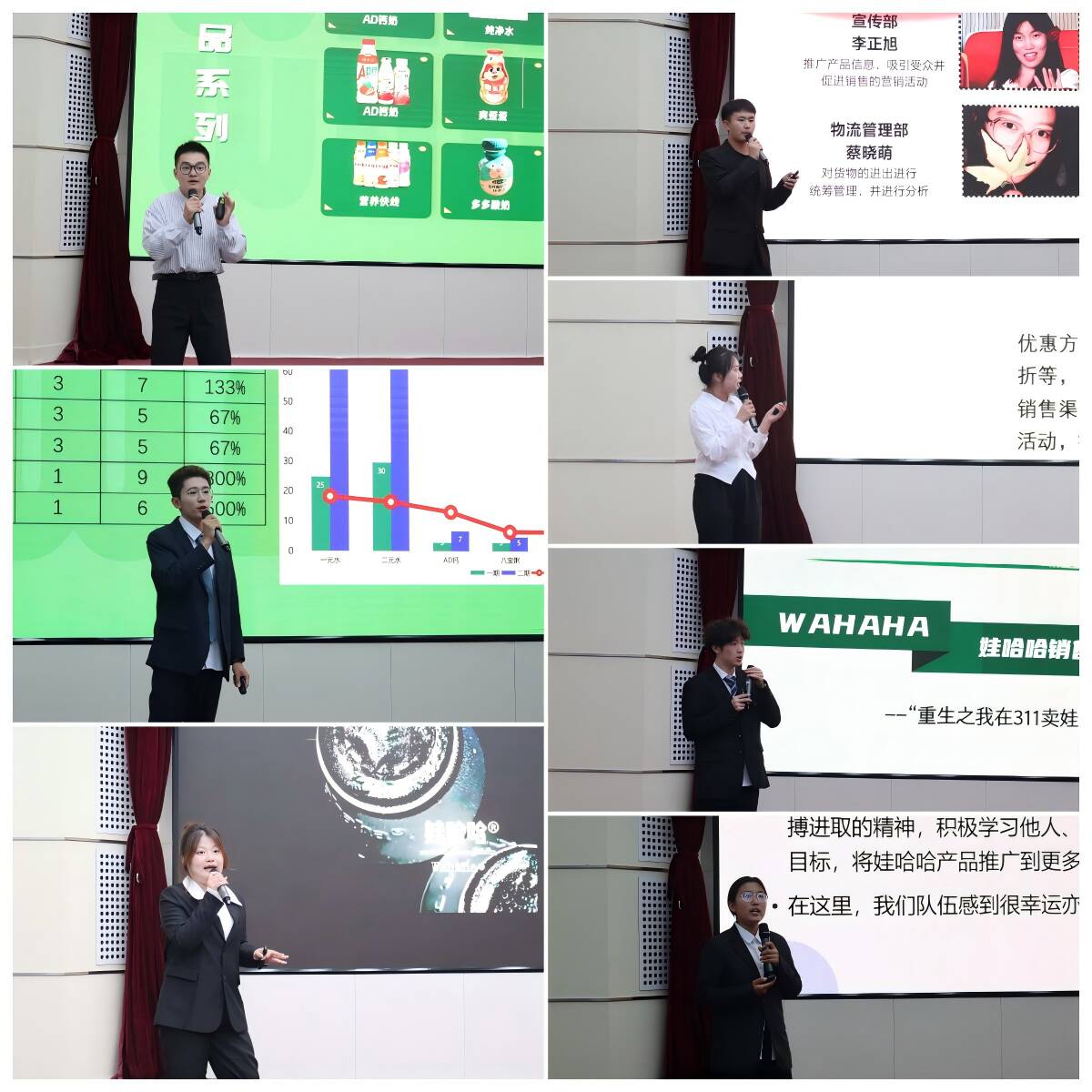 活动伊始,开场舞蹈《上春山》以灵动的舞姿瞬间点燃现场气氛。随后,主持人介绍到场嘉宾并抽取上场队伍。随后进入演讲环节,七组参赛团队围绕娃哈哈产品或品牌,依次登台用PPT和短视频展示创新的营销策划、产品推广及市场拓展策略。上半场,抽到的四组队伍率先登场,从销售团队、市场分析、营销策略到售卖实情,精彩的讲解赢得阵阵掌声。中场的“关键词造句”游戏将现场气氛推向高潮,观众踊跃参与,用与娃哈哈产品相关的词语组成妙趣横生的句子,现场欢声笑语不断。短暂互动后,下半场三组队伍接续展示,凭借独特的创意和详实的方案,继续展现营销智慧。评委综合初赛销量排名和现场演讲表现打分。在紧张的统分过程中,舞蹈《湘君·湘夫人》与演唱《最初的记忆》为观众带来视听享受。最后,主持人公布比赛结果,优秀表现奖、最佳人气奖及一、二、三等奖获奖团队名单逐一揭晓。评委和嘉宾为获奖团队颁发证书与奖品,并合影留念,共同记录荣耀时刻。
