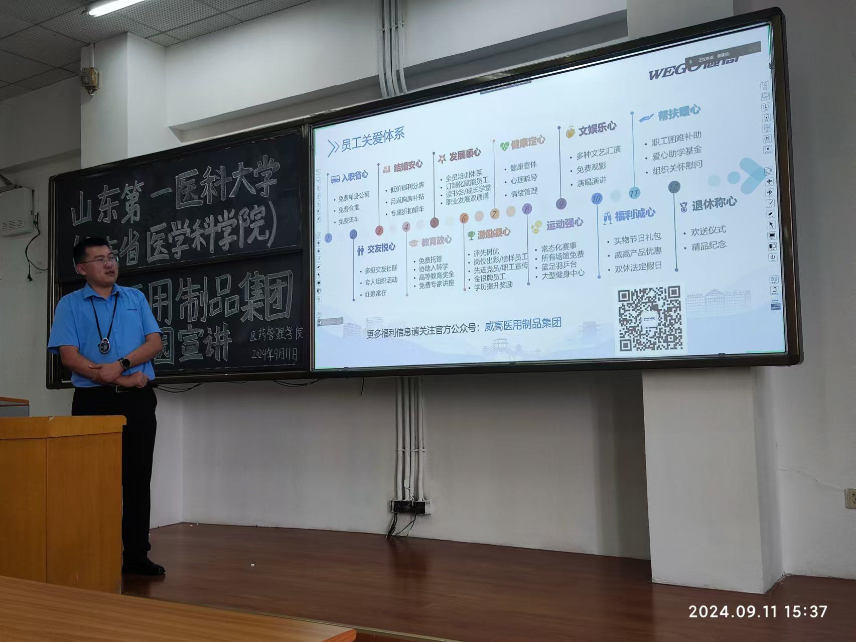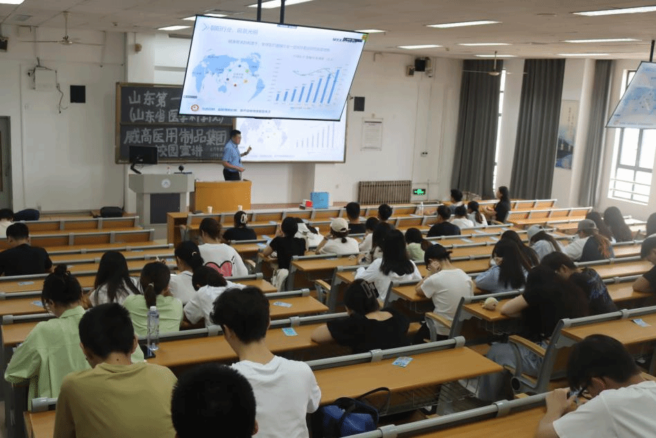 会上,姜建英向同学们深入浅出地分析了当前就业形势与行业前景,并从发展历程、产品领域、行业优势、科研创新、企业文化、薪酬待遇等方面介绍了集团情况。此外,姜建英还针对本次校园招聘的岗位需求、招聘流程等重点进行了详尽说明,吸引了同学们的关注。通过讲解,同学们对集团的行业地位与发展前景有了更清晰地认识。据了解,威高医用制品集团(港股代码:01066)是威高核心产业集团,国内医用护理耗材领域领先企业,员工 1 万余人,专业从事安全输注、临床护理、感染防疫、麻醉、内分泌、生命支持及移动信息化解决方案等相关产品的研发、生产、销售和服务。多项技术打破海外垄断、填补国内空白,参与近 60 项医疗器械领域国家及行业标准的起草、制定,为全球万余家医疗机构提供医疗产品及服务。