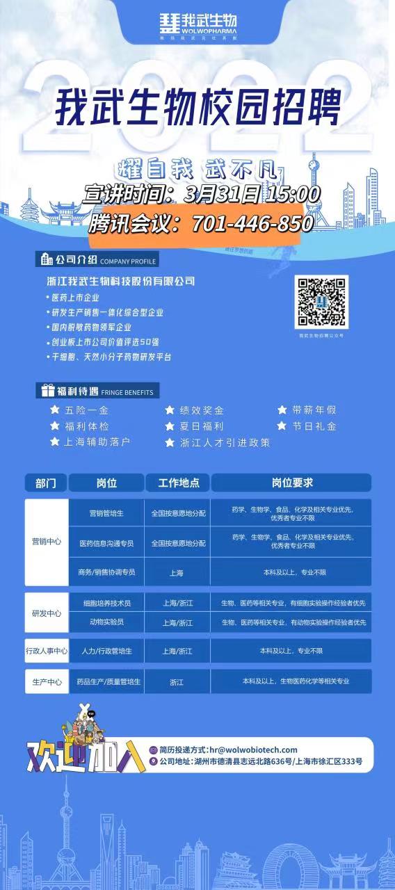 【我武生物 】脱敏行业龙头,只做创新药,集研发生产销售于一体的上市生物制药企业(证券代码:300357),创业板上市公司价值评选50强,市值400亿,2022校园春季招聘开始了!