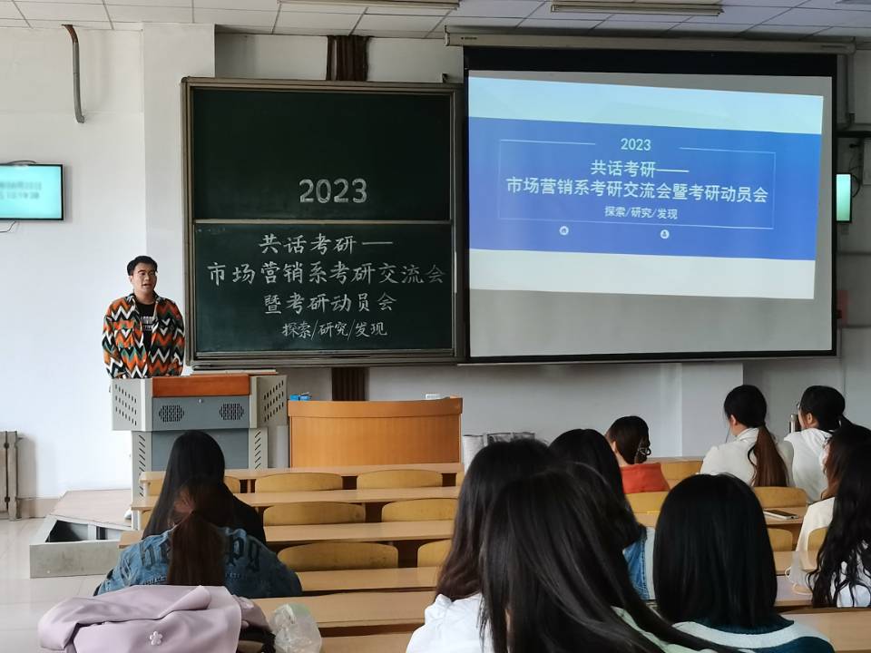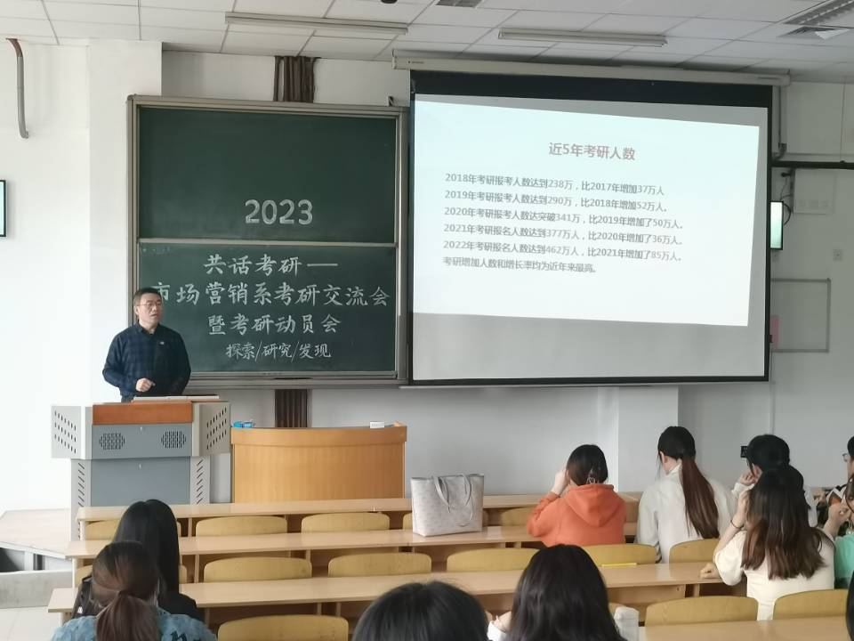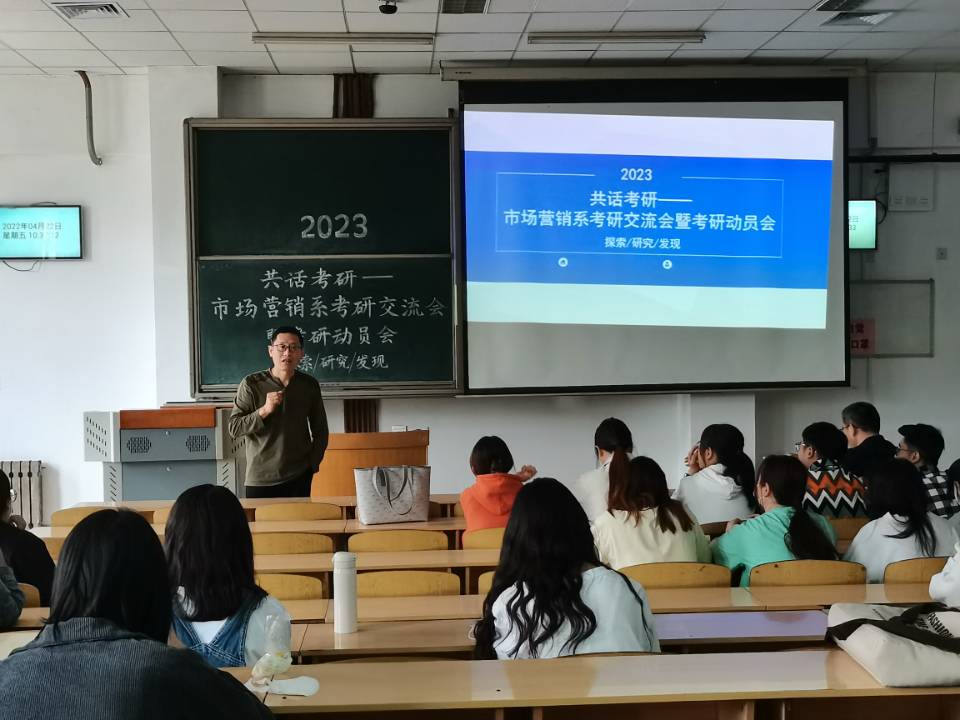 “领航工程”实施以来,市场营销系党支部与市场营销系积极下沉联系班级,认真调研,开展系列活动,助力学生成人成才。为帮助2019级和2020级市场营销专业学生更好地了解考研的各种注意事项,加强同学们对考研专业选择和研究生考试科目的认识,提高德赢官网市场营销专业学生的考研热情,明确学生考研目标,掌握相关学习技巧,营造良好的学习氛围,于4月22日上午在教学南楼C座3010教室为市场营销专业举办考研交流会暨考研动员会。市场营销系党支部书记王滨老师、市场营销系主任马振鹏老师、市场营销系党支部支委崔行武老师出席此次会议,特别邀请赵睿智、高梦琦等五名今年考研上岸的优秀学生出席本次会议,马振鹏老师做了主题发言。