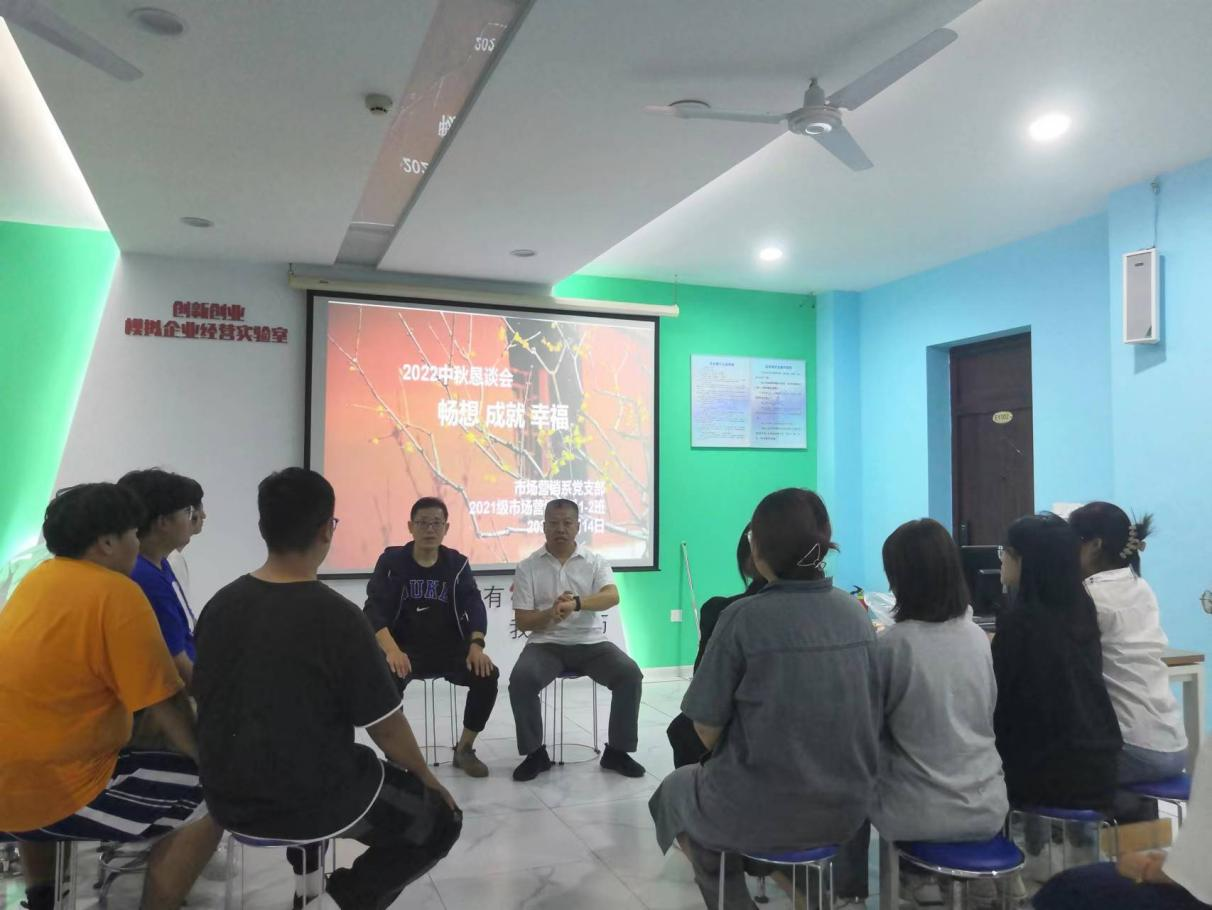 为帮助和指导2021级市场营销专业学生更好地应对大二的学习和生活,9月14日晚19:00点在物理楼E1102市场营销系党支部与联系的班级2021级市场营销本科专业的部分同学开展“领航工程”,举办了以“畅想 成就 幸福”为主题的中秋恳谈会。市场营销系党支部书记王滨老师、系主任崔行武老师出席了此次恳谈会。恳谈会特别获得了泰安时代儒商经贸有限公司的赞助。