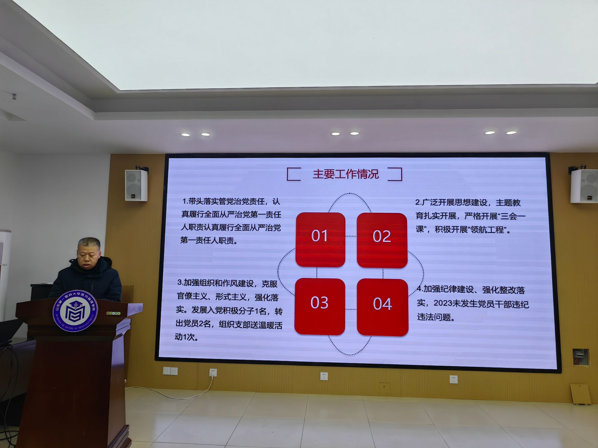 2月25日,vwin德赢ac米兰官方网召开2023年度基层党组织书记履行全面从严治党主体责任和抓基层党建工作述职评议会议。学院党委书记杜江山主持会议并作点评讲话。学院领导班子成员、党委委员、党支部书记和全体党员参加会议。