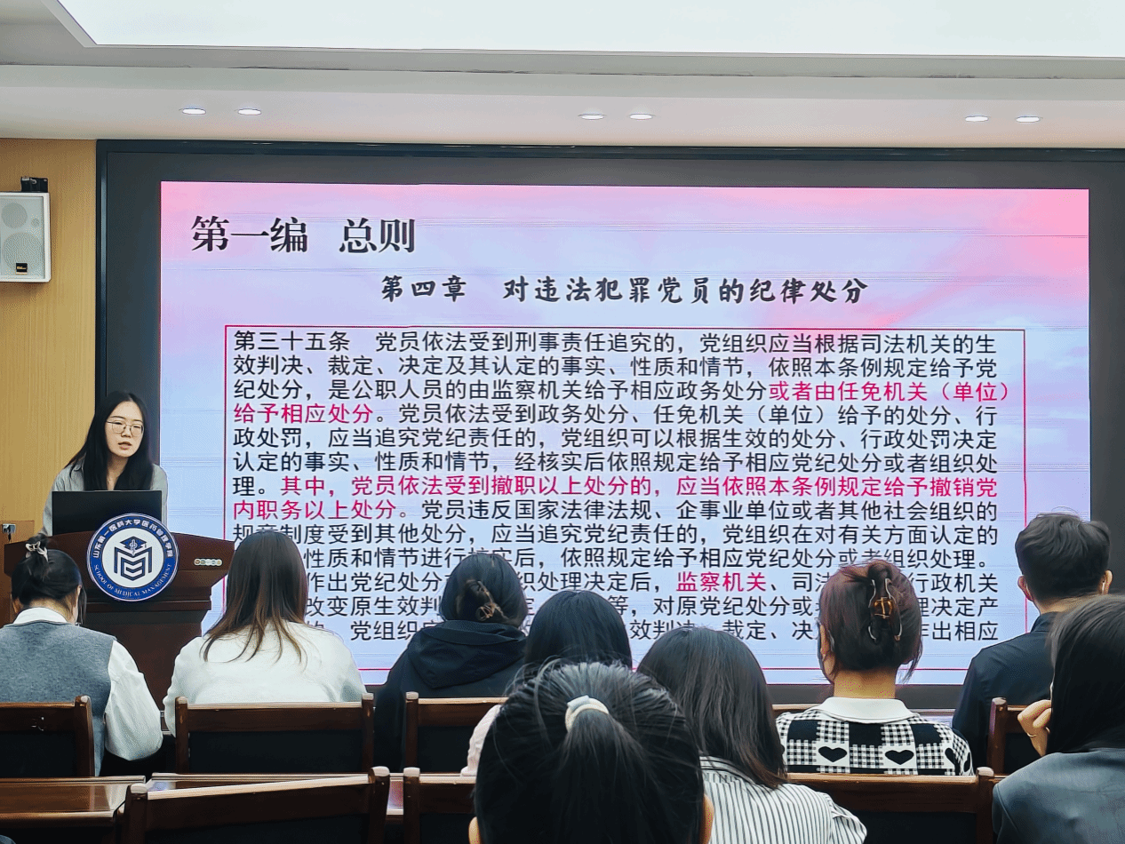 学生第三党支部书记刘晓丹带领同学们逐条学习了《中国共产党纪律处分条例》,帮助学生党员深入理解和把握《条例》修订的实践要求,做到原原本本学,逐章逐句学,确保党纪学习教育取得实实在在的成效。