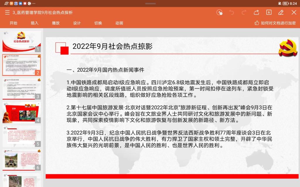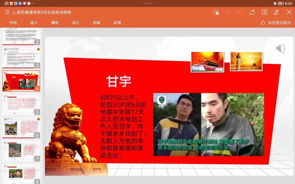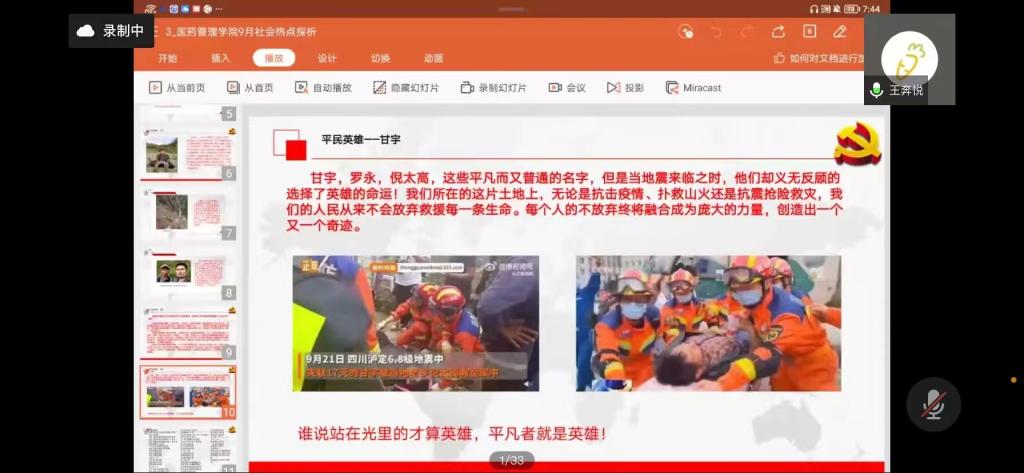 首先陈梅菱同学为大家播报了2022年9月份国内外社会热点新闻事件,在这些事件中,四川泸定6.8级地震牵动着每一个人的心,在这次地震中有一位为了无数人的生命而不顾自己生命的英雄人物甘宇,王奔悦同学带领大家共同学习了英雄甘宇的感人事迹。甘宇用实际行动诠释了什么叫“舍生忘死”、什么叫“为人民牺牲一切”!他身上体现出的一是奋不顾身的精神:面对地震,甘宇明白,如果不逃走,可能就错过了逃生的机会,可是他也很清楚,泄洪闸不提起来,就可能会冲毁整个村子,山下的群众的生命财产就会受到威胁,甘宇毅然决然地选择了不顾余震的危险,踩着垮塌的山石,和同事一起去开闸泄洪,保护山下群众安全;二是面对困境绝不言弃的精神:地震后17天,甘宇终于被找到,是救援人员、村民们的坚持,是甘宇自身的坚持,身上多处伤疤,多处骨折,淋了9天大雨,还伴有严重感染,靠着喝水吃野果维持生命,不抛弃不放弃,如此的双向奔赴,甘宇最终得以获救;三是平凡岗位勇往直前的精神:甘宇的岗位是平凡的,甘宇本人也是平凡的,但是平凡的他在平凡的岗位上做了不平凡的事情,让自己也变得不平凡起来,没有甘宇的坚守岗位,村民就会有危险,没有村民的感恩搜寻,甘宇最终不一定能够获救。