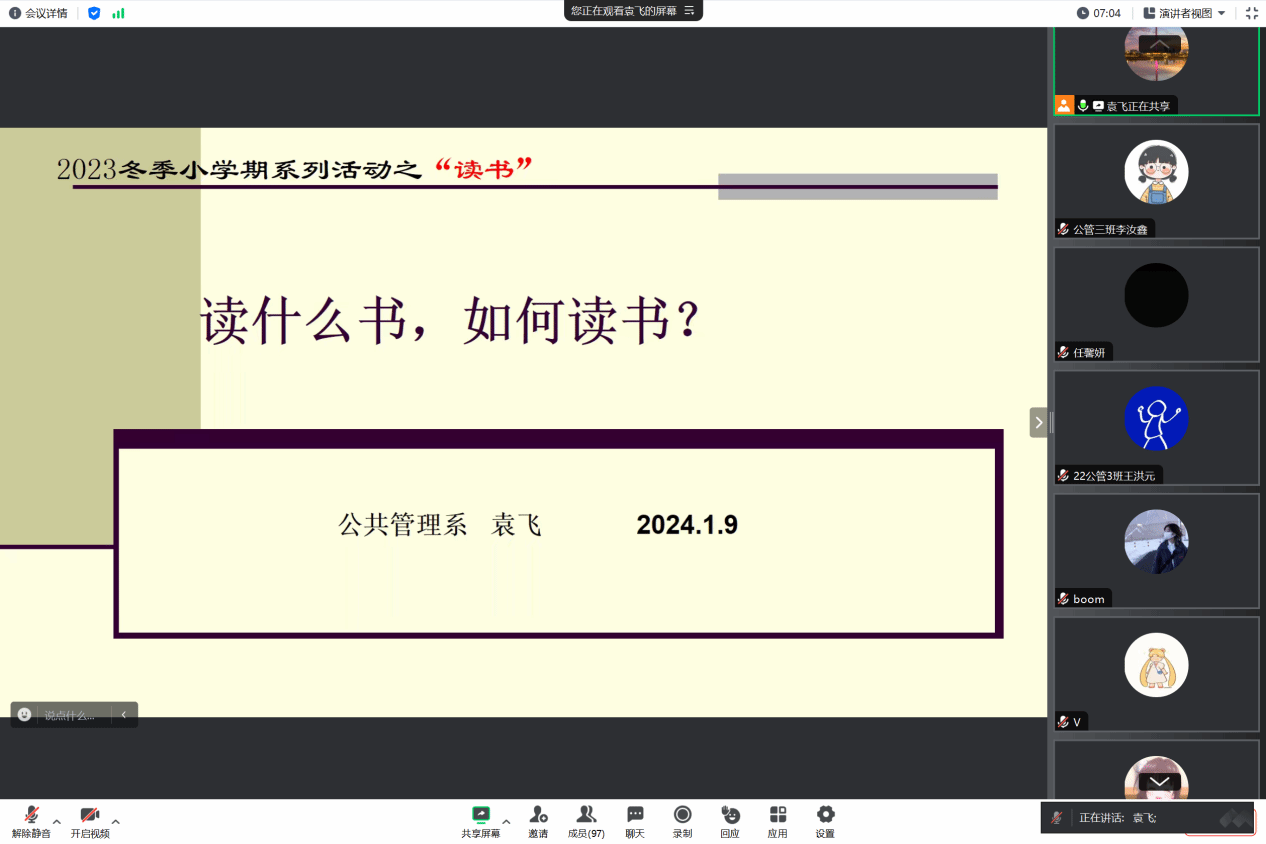 袁飞老师以“读什么书,如何读书?”为主题为同学们进行了线上读书讲座,鼓励同学们利用课余时间多阅读。他指出:“读书犹如建立一个账户,需要多年的积累,‘到头来你会觉得,读好书今后你会很有用,就像建立了一个丰厚的精神账户,会让你在今后的生活里不断支取。’”他建议同学们阅读应尽可能广博,立足于卫管但又不囿于卫管类专业书籍文献,还可以精读一些经典,广泛阅读一些给人智慧、有所启迪的其它社科书籍甚至是文学名著。