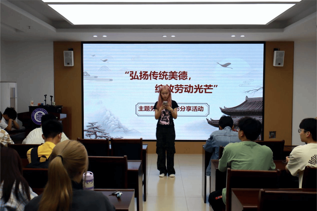 春光美如斯,正是观影时。劳动者观影分享活动以小组为单位,通过PPT演讲的形式进行展示和分享。有为杂交水稻的研发和保护国家粮食安全而奋斗终身的《袁隆平》;有消防员英勇无畏、团结协作,保障人民生命和财产安全的《烈火英雄》;有在各个时期的不同群体不忘初心、砥砺前行,几代父辈不断传承中华民族精神的《我和我的父辈》。本次活动通过电影分享的形式对我国不同时期的劳动者群像进行分析,饱含着同学们对优秀传统文化的认可和对劳动者精神的尊重和赞扬。